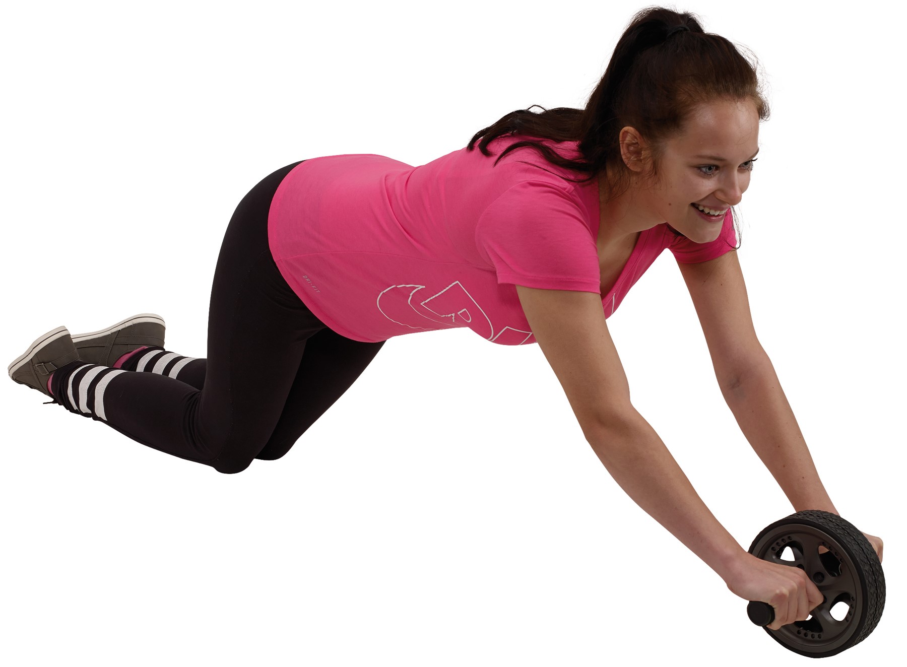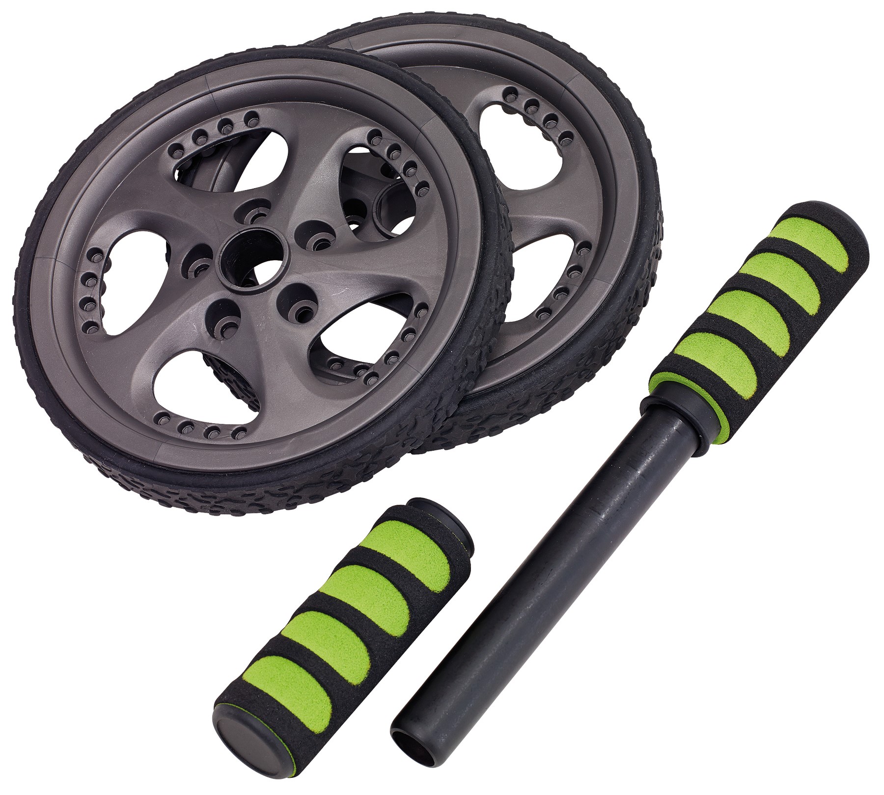 Posilňovač brucha FIT WHEEL – tiež na posilnenie a vyrysovanie prsných svalov, rúk, ramien a chrbtových svalov: 2 robustné plastové kolesá s gumovým profilom, kovová tyč pre spojenie kolies, 2 protišmykové rukoväte z peny - balené samostatne, jednoduchá montáž, dodávané v darčekovom balení - ideálne pre šport a fitness cvičenie