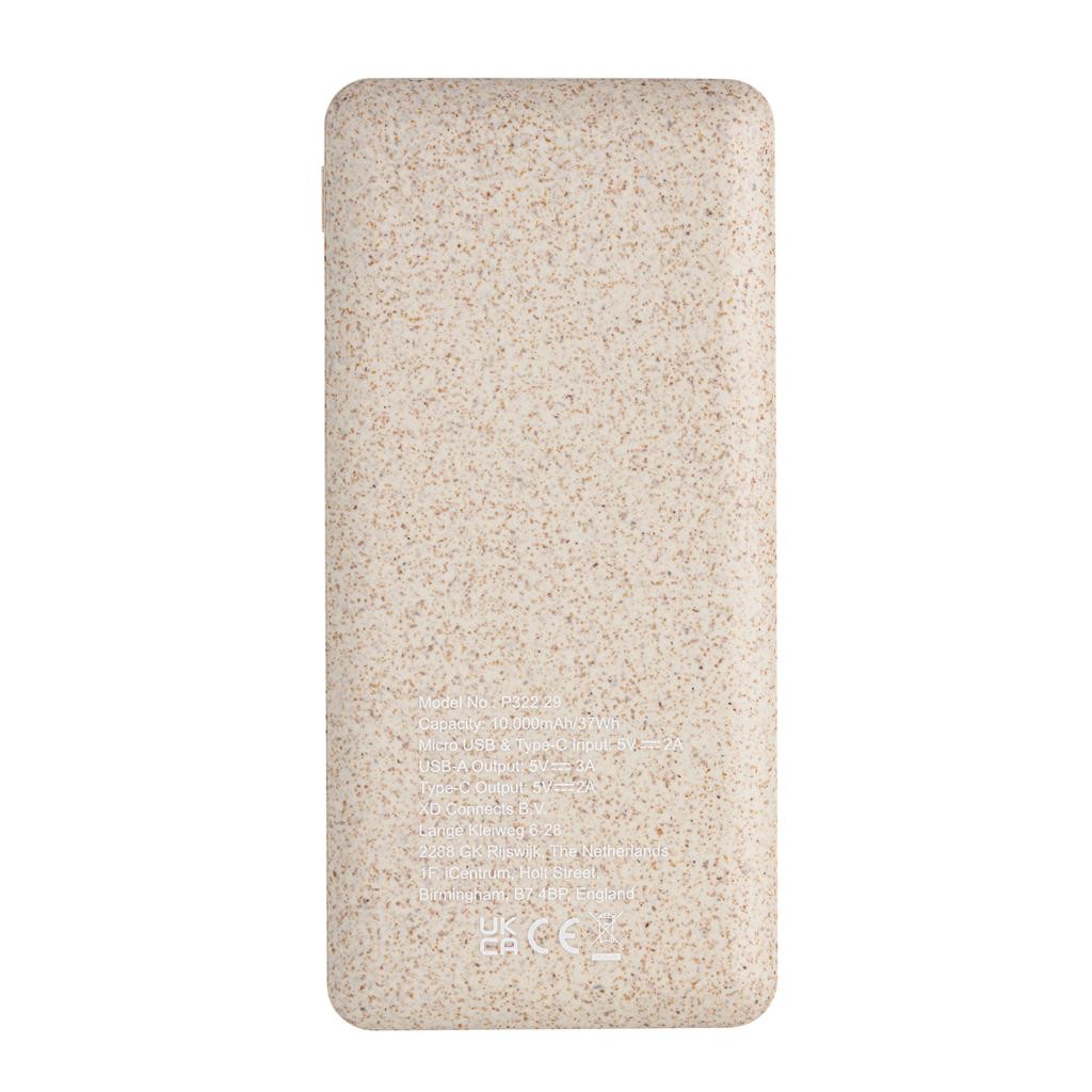 Mimoriadne kompaktná powerbanka vyrobená z kombinácie pšeničných vlákien (35%) a ABS. Kvalitná lítium polymérová batéria série A s kapacitou 10 000 mAh plne nabije mobilný telefón až 4x. Duálny výstup USB, vrátane moderného USB C. Svetelné indikátory stupňa nabitia. Micro USB vstup: 5V / 2A, USB C vstup: 5V / 2A. USB výstup: 5V / 3A, USB C výstup: 5V / 2A. Vrátane micro USB nabíjacieho kábla z TPE. Produkt i príslušenstvo bez PVC. 1 batériou typu Li-poly súčasťou balenia.