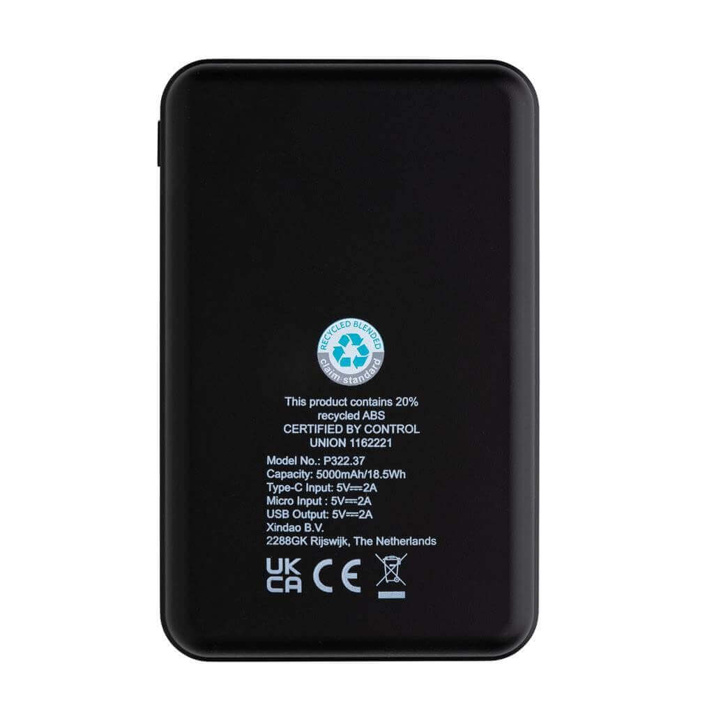 Powerbanka s kapacitou 5 000 mAh vyrobená z RCS recyklovaného ABS plastu so soft touch úpravou a FSC® certifikovaného bambusu. RCS (Recycled Claim Standard) je globálny štandard, ktorý umožňuje overiť použitie recyklovaného materiálu v produkte naprieč celým dodávateľským reťazcom. Podiel použitého recyklovaného materiálu vzhľadom na celkovú váhu produktu: 20 %. Obsahuje vysoko kvalitné lítium polymérovú batériu radu A s kapacitou 5 000 mAh pre plné nabitie telefónu až 3x. Vrátane indikátorov stavu nabitia. Micro USB a USB vstup C: 5V/2A. Výstup: 5V/2A. Vrátane nabíjacieho kábla z recyklovaného TPE. Balené v FSC® krabičke. 1 batéria typu Li-ion súčasťou balenia.