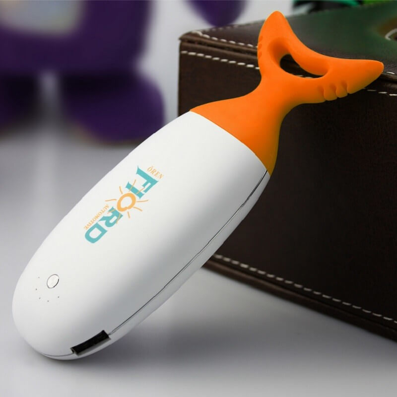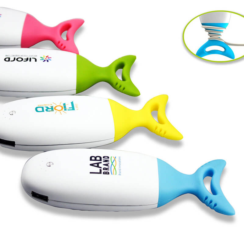 Originálne Power bank v tvare ryby, pričom chvost slúži aj ako praktický držiak kábla. Nabitie Power Bank zaistíte cez USB konektor počítača (prípadne sieťový adaptér) a cez micro USB, popr. iný konektor následne nabijete Váš mobilný telefón alebo iné zariadenie. Plne nabitá Power Bank zaistí niekoľkonásobné nabitie mobilného telefónu v závislosti na kapacite batérie Power banky a na kapacite batérie telefónu (3000 mAh cca 1-2x, 4000 mAh cca 2x, 5000 mAh cca 2-3x a 6000 mAh cca 3-4. Nabíja iPhone, mobily, MP3, kamery a pod. LED diódy zobrazujú zostávajúcu kapacitu batérie Power banky, rôznofarebné LED podsvietenie priehľadnej chvostovej plutvy s dvoma módmi - zábavné svetelné efekty alebo núdzové červené svetlo s rôznou frekvenciou blikania. Široké možnosti reklamnej potlače plastového tela - buď tampón, alebo aj celofarebný CMYK.