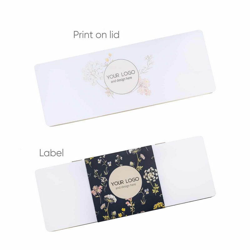 Pralinky dávame do elegantnej, značkovej plechovky ideálnej na opätovné použitie, v súlade s našou filozofiou zero waste. Veľkú reklamnú plochu je možné personalizovať 2 spôsobmi: digitálnou potlačou na etiketu alebo digitálnou UV tlačou priamo na plechovku. Opýtajte sa nášho tímu, ktorá možnosť bude pre vašu značku fungovať lepšie!