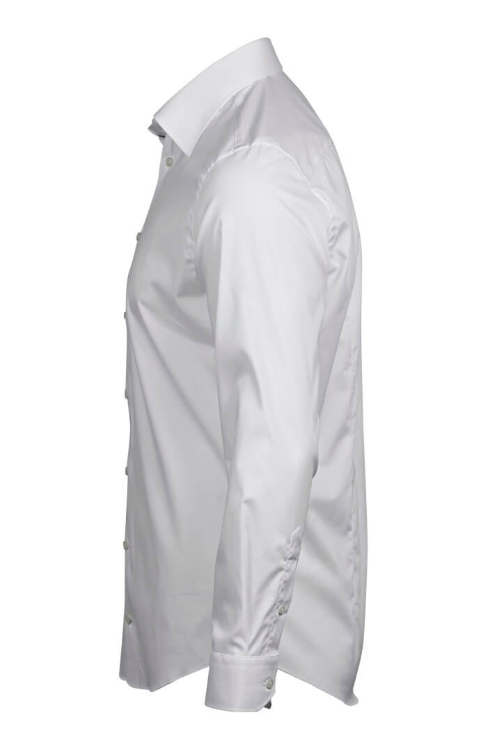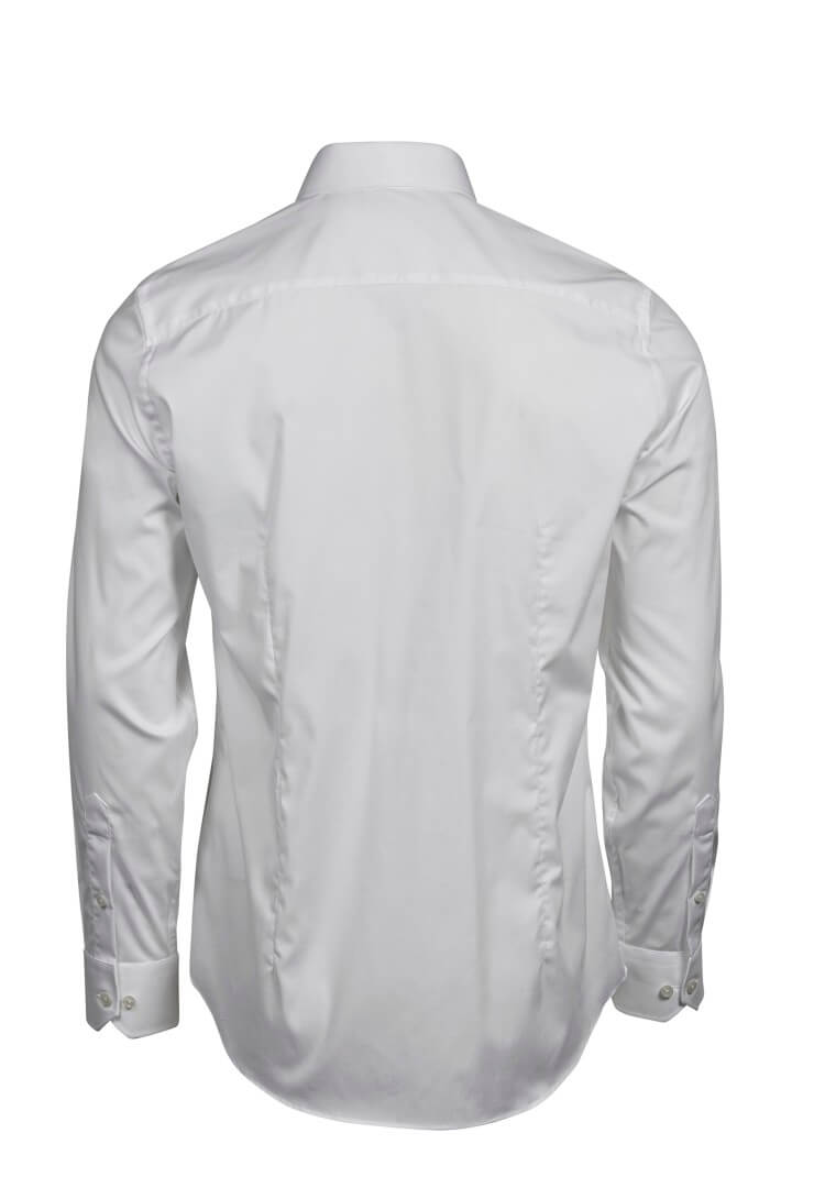 Priliehavá pánska strečová košeľa | Gombík pod golierom s neviditeľným umiestnením gombíkov a dvoma manžetami na gombíky | Priliehavý strih | Podlepený golier a manžety | Sklad vzadu | Záševky na chrbte | Zaguľatený spodný lem