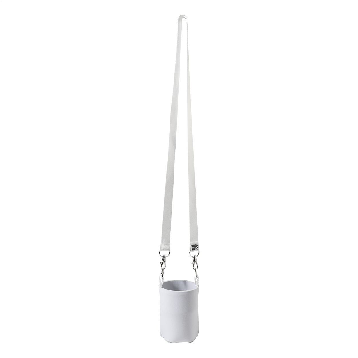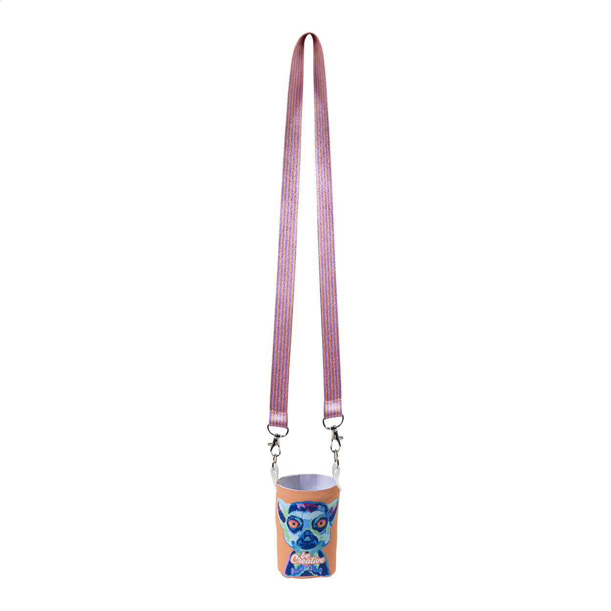 Chladiaca taška na zákazku z neoprénu z RPET na hliníkové plechovky s objemom 0,33 l s farebne potlačenou šnúrkou z RPET s kovovými karabínami. S celoplošnou sublimačnou potlačou, cena nezahŕňa tlačovú prípravu. Min. mn.: 100 ks. New. Go Green. Be Creative