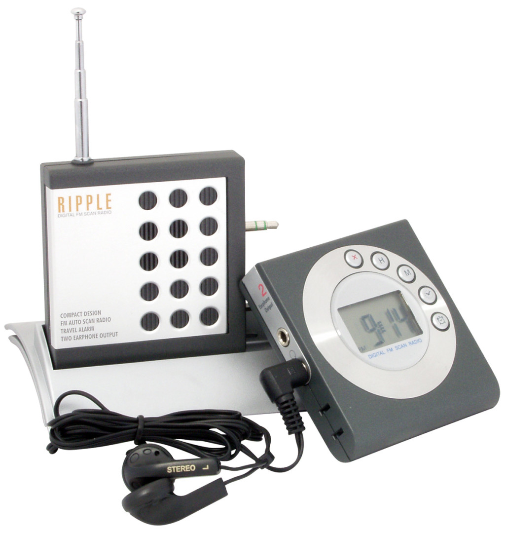 Autoscan rádio s oddeliteľným reproduktorom, slúchadlami, digitálnymi hodinami a budíkom s plastovým stojanom.