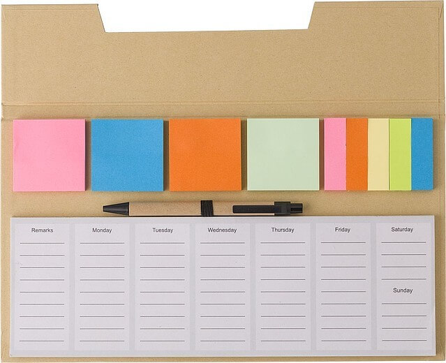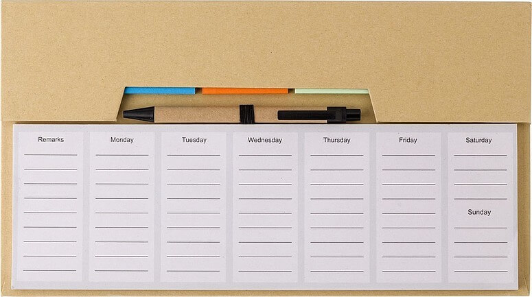 Súprava značkovacích a poznámkových lístkov a guličkového pera z kartónu a plastu. Lístkov je v každej farbe 50. Prvých 5 poznámkových listov je predtlačených týždenným plánovačom, ostatné sú čisto biele. Odporúčaná technológia tlače: tampóntlač T2. Maximálna veľkosť tlače: 50 x 50 mm. Rozmery: 31,1 × 17,2 × 1,3 cm. Kartónové množstvo v ks: 60.
