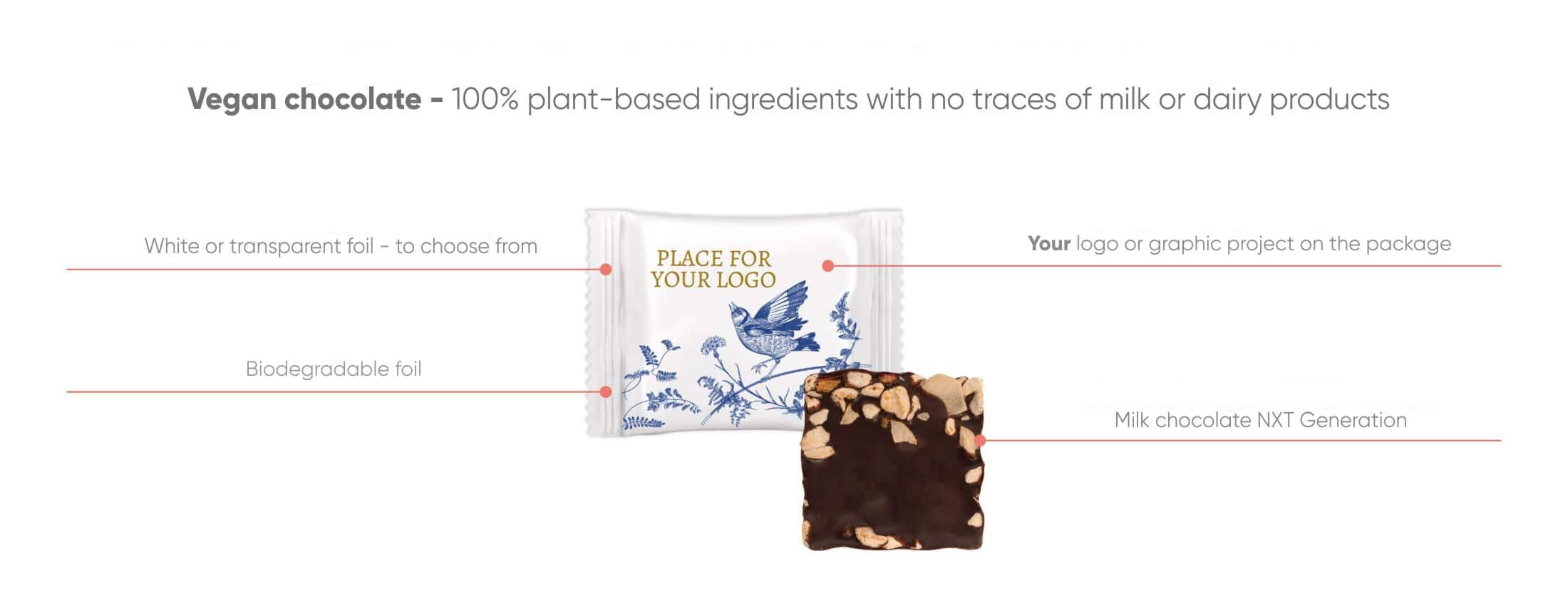 Nepravidelný tvar z vegánskej čokolády so zdravými ingredienciami je skvelý nápad na reklamnú sladkosť do kancelárie. Pretože všetci milujeme sladké prekvapenia!