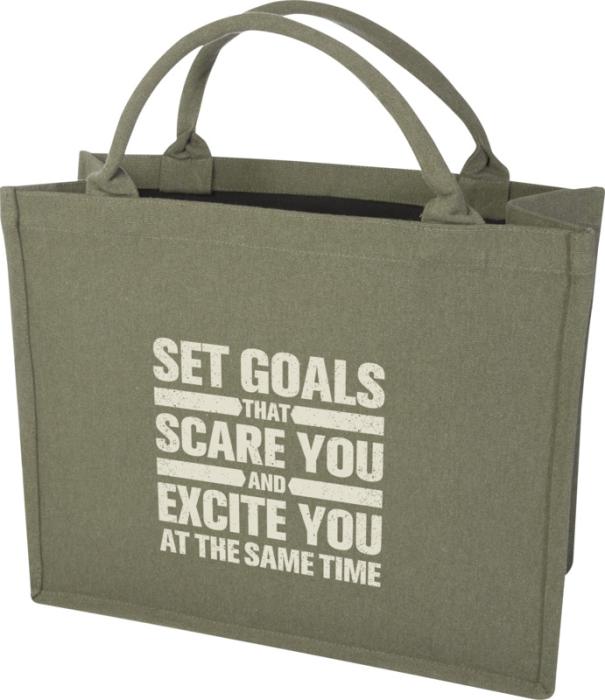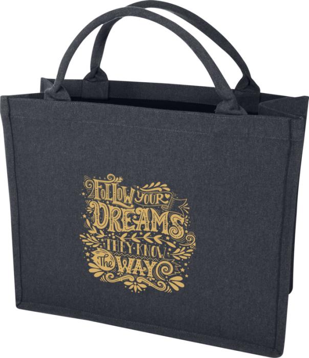 Recyklovaná nákupná taška Page sa perfektne hodí na uloženie každodenných vecí. S krátkymi, ale pevnými ušami sa táto taška pohodlne nosí po dlhú dobu. Nákupná taška obsahuje recyklované vlákna Cyclo®, pri ktorých sa používa vopred vytriedený odpad, ktorý určuje farbu priadze. Tieto vlákna nielenže znižujú dopyt po pôvodných zdrojoch, ale tiež prejavujú záväzok k cirkulárnemu životu, stelesňujú podstatu znižovania odpadu a podporujú systém s uzavretným reťazcom. Každá taška je tiež dodávaná s indikátorom Aware™. Táto inovatívna funkcia umožňuje používateľom sledovať pôvod a cestu ich položky prostredníctvom QR kódu, čím zvyšuje transparentnosť v dodávateľskom reťazci a podporuje pevnejšie prepojenie medzi produktom a jeho výrobným procesom. 70% Recyklovaná bavlna, 30% Recyklovaný polyester, 500 g/m2.