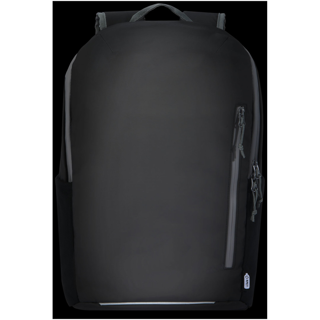Vodeodolný batoh na notebook vyrobený z GRS certifikovaných recyklovaných materiálov, vrátane zipsov. Obsahuje polstrovanú priehradku na 15" notebook s bočným otvorom pre rýchly prístup, niekoľko sieťovaných vreciek, predné vrecko na zips a reflexné lemovanie pre zviditeľnenie. Vytvarovaná a polstrovaná podložka a nastaviteľný hrudný popruh umožňujú pohodlné nosenie aj pri plnom naložení. Z recyklovaných materiálov GRS je vyrobená hlavná tkanina, podšívka, popruhy a zipsy Kapacita: 21 litrov Neobsahuje PVC.