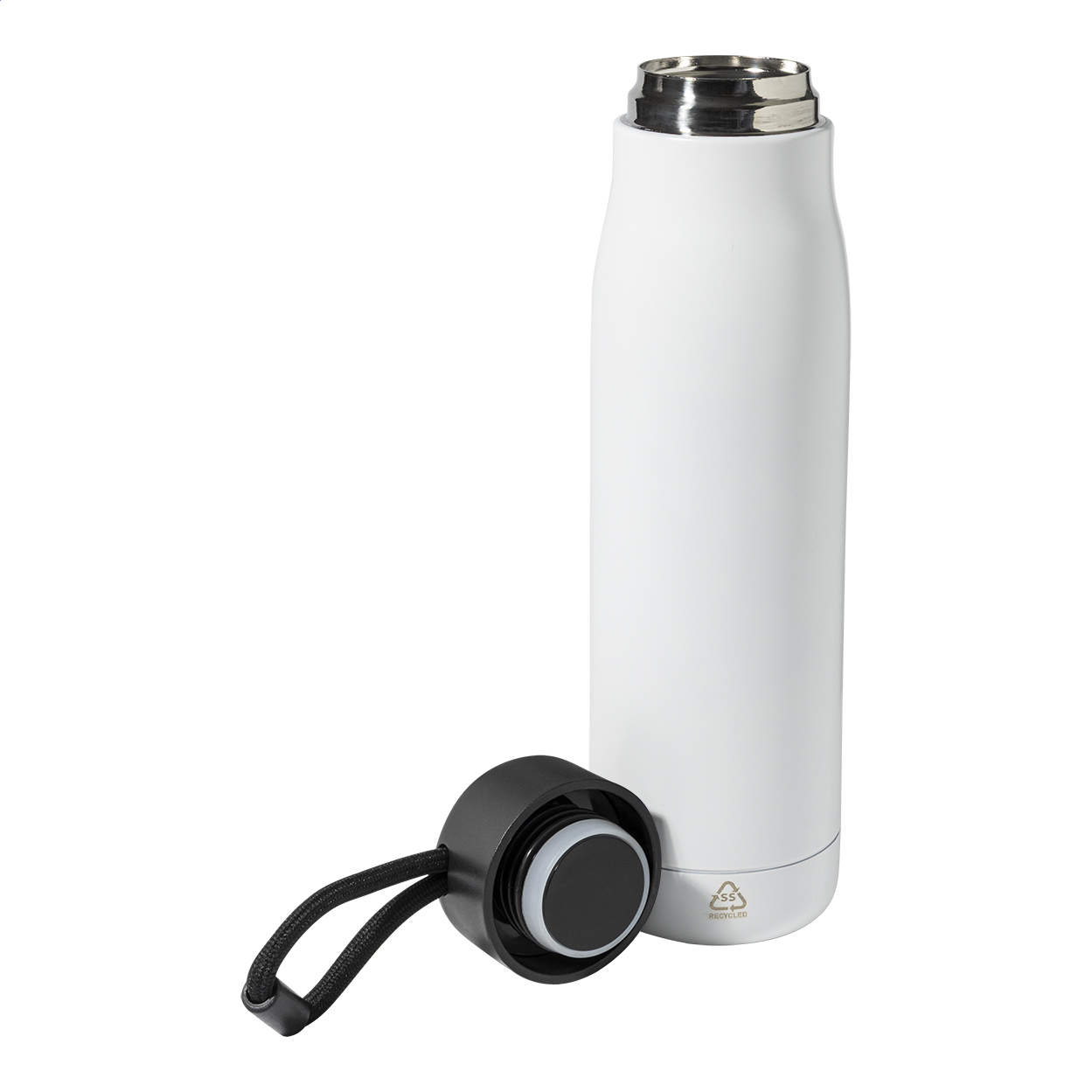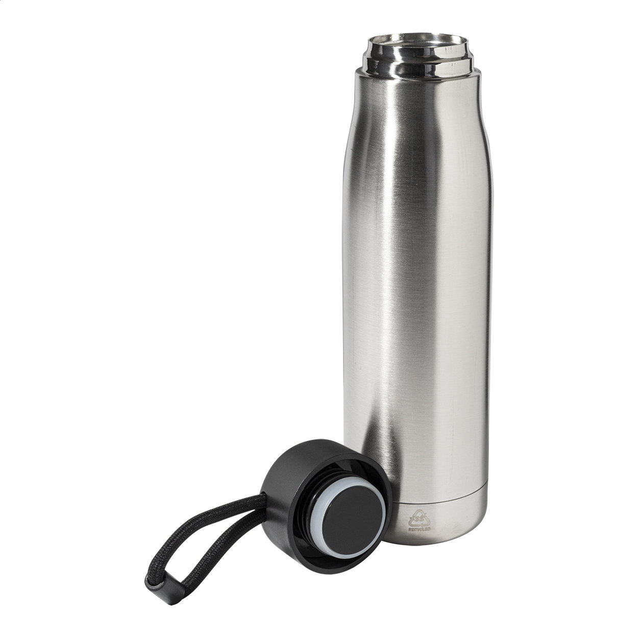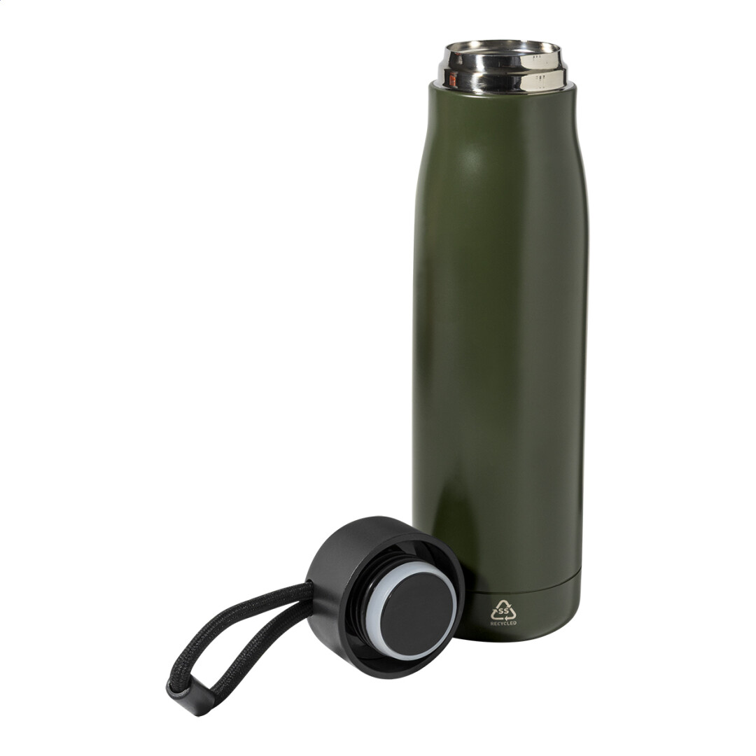 Dvojstenná, vákuovo izolovaná fľaša z recyklovanej nerezovej ocele s PP viečkom a integrovaným pútkom na nosenie so šnúrkou. 500 ml. New. Go Green. Vhodné do umývačky riadu: Nie. Vhodné do mirkovlnnej rúry: Nie. Typ steny: Dvojitá stena. Typ izolácie: Vákuová izolácia. Doba izolácie za studena: 12 hodín. Doba izolácie za horúca: 6 hodín. Odolné voči poliatiu / nepriepustné: Nepriepustné