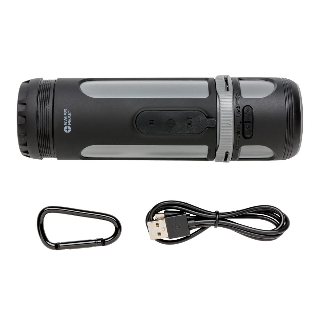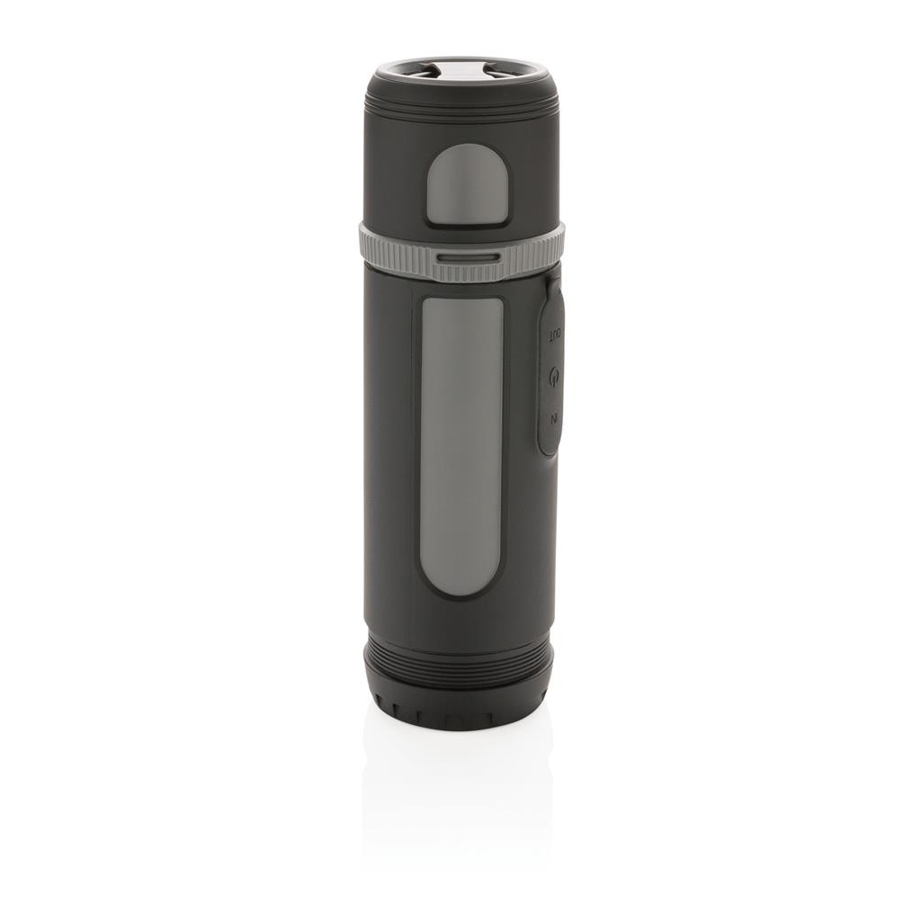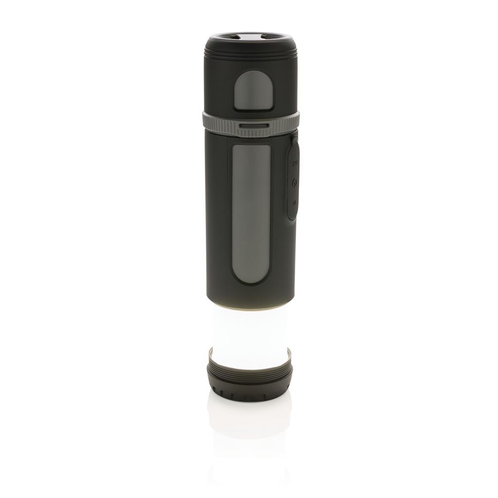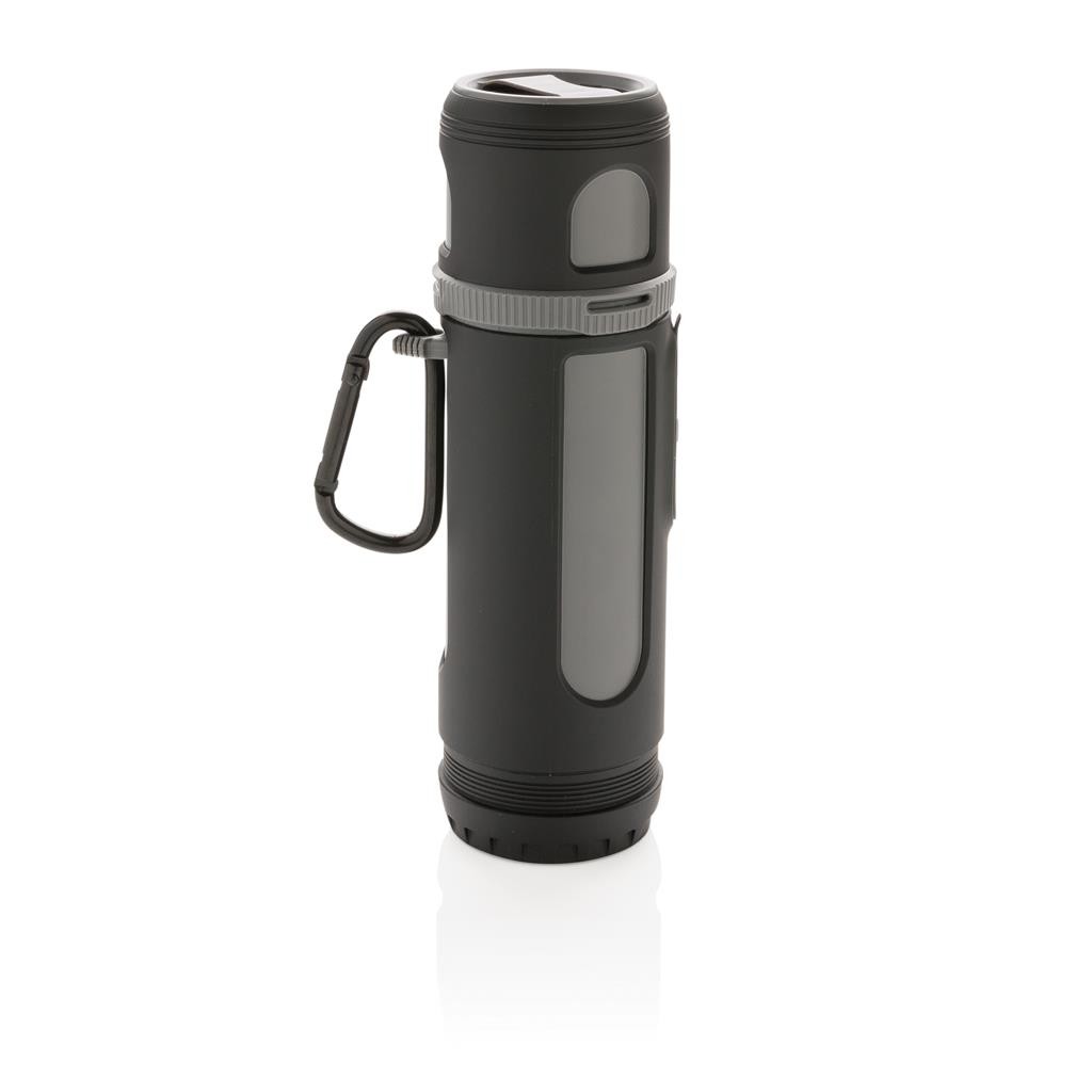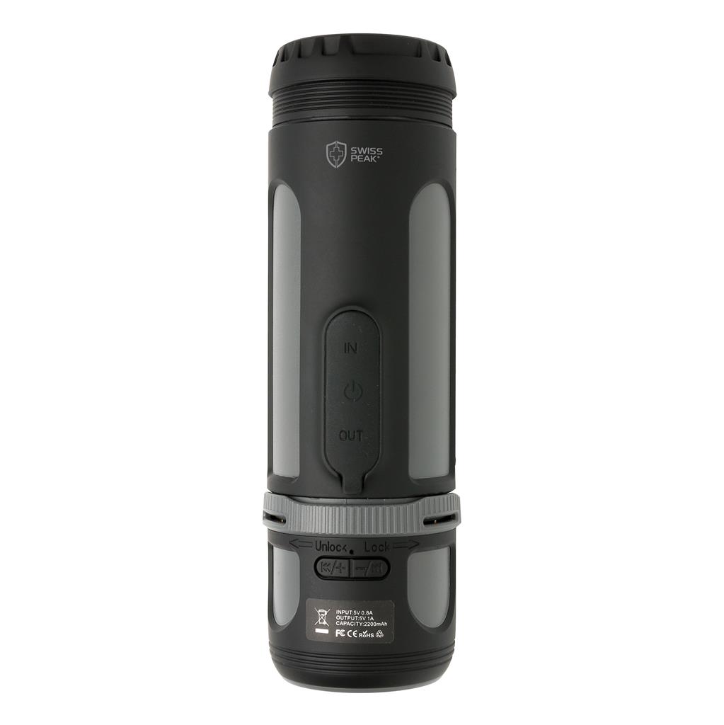 Jedinečný univerzálny odolný nástroj 4 v 1. Obsahuje POWERBANK, bezdrôtový reproduktor, kampingové svetlo a svietidlo. 3W bluetooth reproduktor umožňuje prehrávanie po dobu až 18 hodín na jedno nabitie. Ideálny na dlhé cesty. Záložný zdroj má kapacitu 4 500 mAh, výstup 5 V / 2 A a vstup 2 A. LED svetlo je veľmi jasné (200-250 lm) a vhodné pre vonkajšie použitie. Svietidlo je možné nastaviť v 4 režimoch (normálne, silné, slabé a blikajúce svetlo). Dodávaný s karabínou pre zavesenie napríklad na batoh. 1 batériou typu Li-ion súčasťou balenia.
