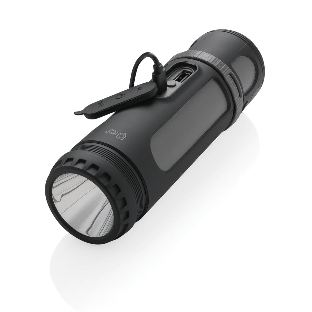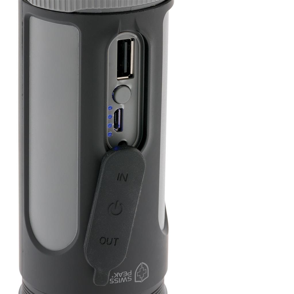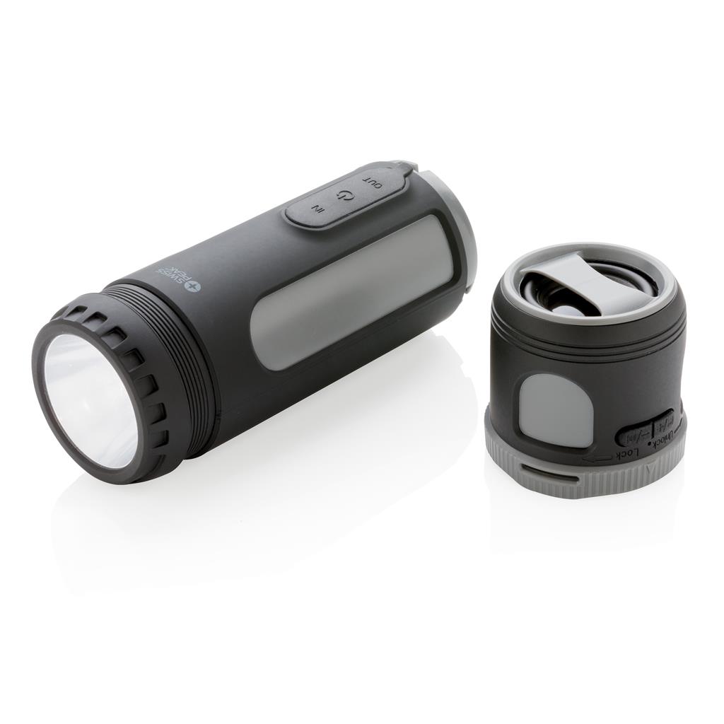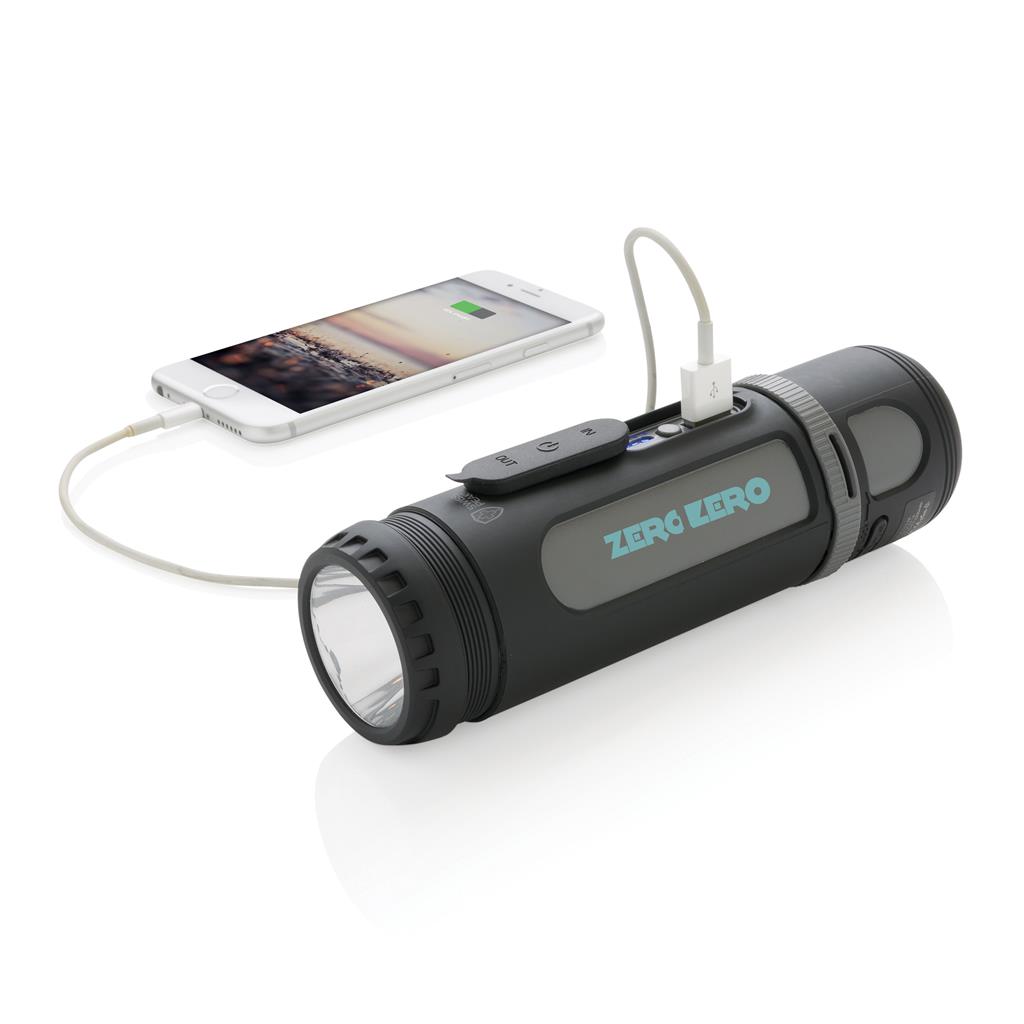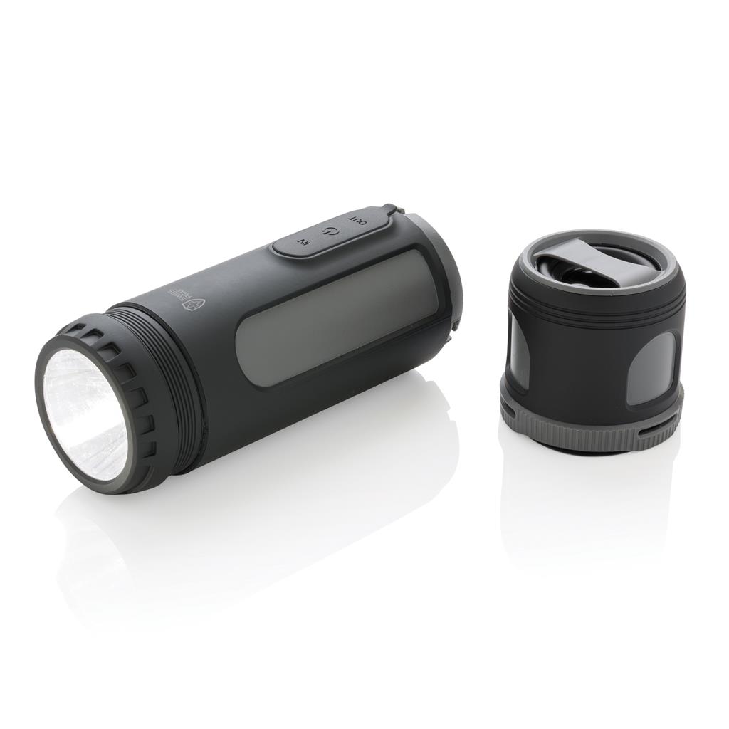 Jedinečný univerzálny odolný nástroj 4 v 1. Obsahuje POWERBANK, bezdrôtový reproduktor, kampingové svetlo a svietidlo. 3W bluetooth reproduktor umožňuje prehrávanie po dobu až 18 hodín na jedno nabitie. Ideálny na dlhé cesty. Záložný zdroj má kapacitu 4 500 mAh, výstup 5 V / 2 A a vstup 2 A. LED svetlo je veľmi jasné (200-250 lm) a vhodné pre vonkajšie použitie. Svietidlo je možné nastaviť v 4 režimoch (normálne, silné, slabé a blikajúce svetlo). Dodávaný s karabínou pre zavesenie napríklad na batoh. 1 batériou typu Li-ion súčasťou balenia.