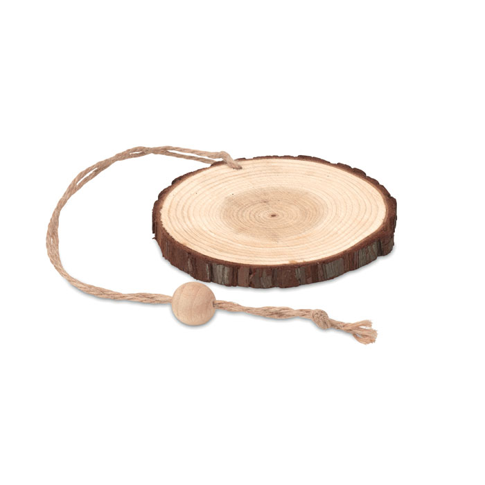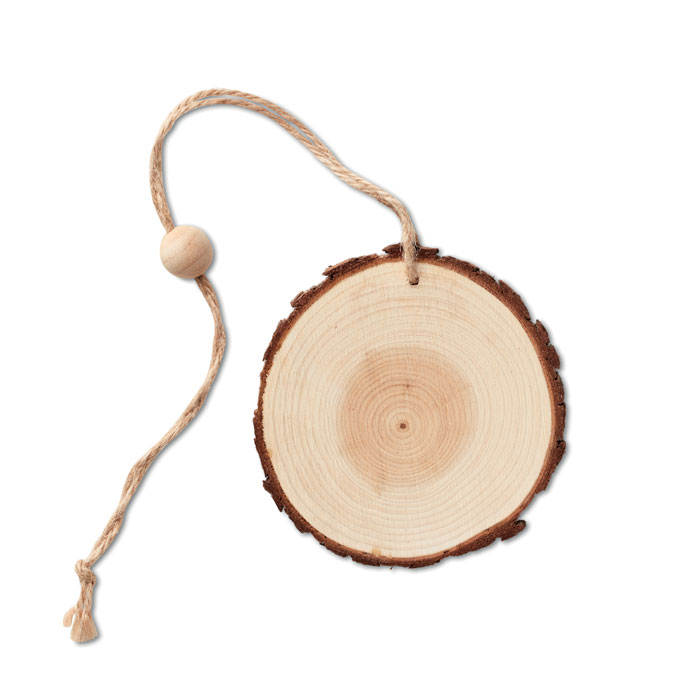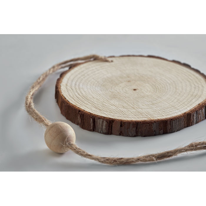 Drevená okrúhla ozdoba s okrajom z kôry a šnúrkou.