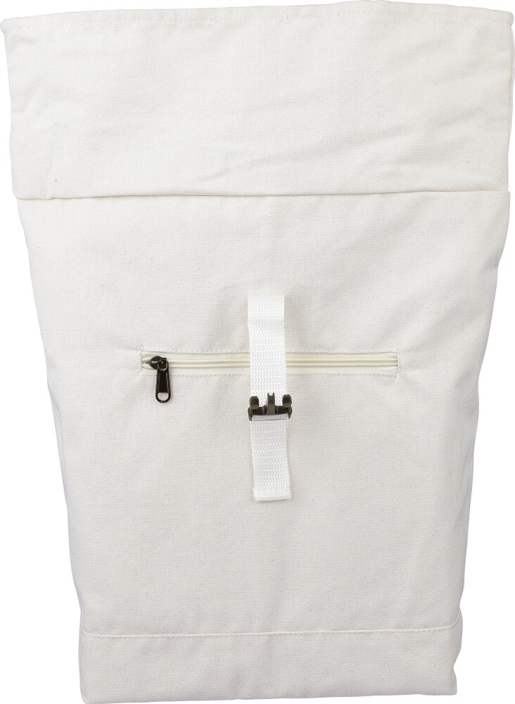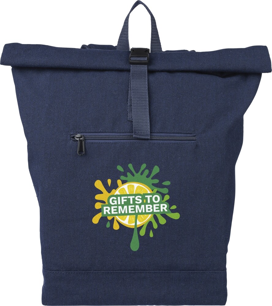 Batoh s rolovacím vrškom z recyklovanej polybavlny (330 g/m2) s podšívkou z polyesteru 210D a zapínaním na plastovú pracku. Má objem 15 litrov, veľkú priehradku na zips s priehradkou na 15-palcový notebook, dve vnútorné priehradky a jednu vonkajšiu priehradku. Dizajn zahŕňa pútko na nosenie v hornej časti, polstrované nastaviteľné popruhy a malé predné vrecko na zips. Nosnosť: 14 kg. Rozmery: 27 x 15 x 53 cm