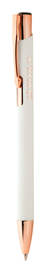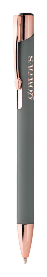 Guľôčkové pero z recyklovaného hliníka s pogumovaným povrchom a detaily z ružového zlata. So špeciálnou povrchovou úpravou na zrkadlové laserové gravírovanie vo farbe ružového zlata. S modrou náplňou.