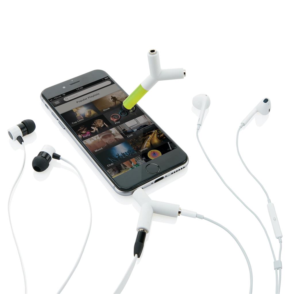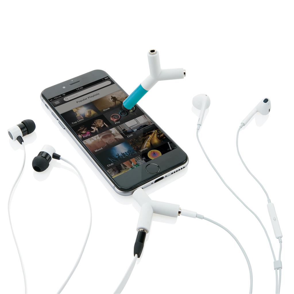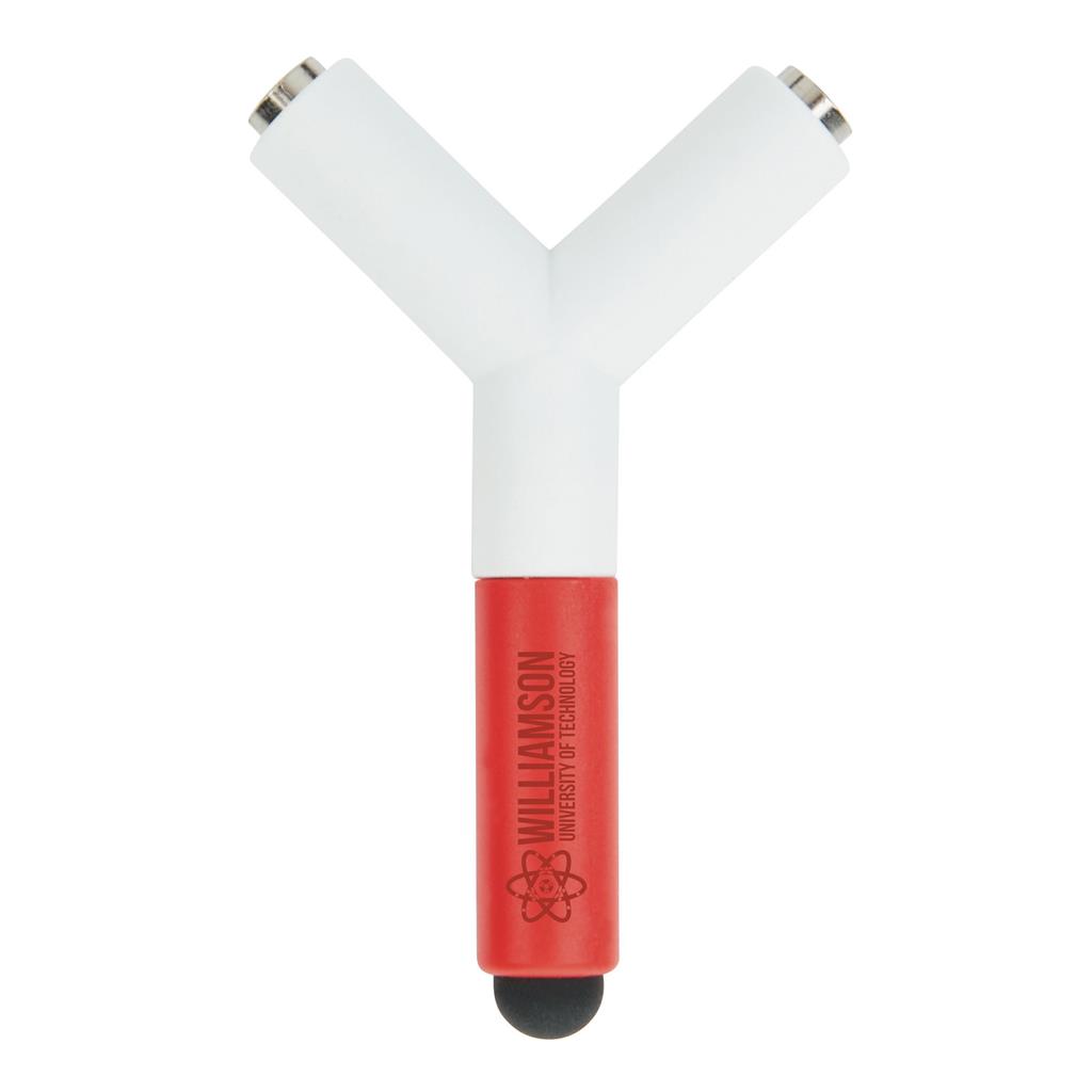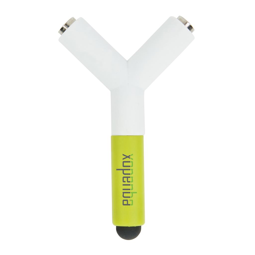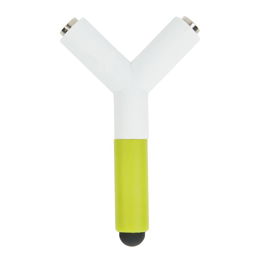 Univerzálny rozbočovač ABS s 3,5mm konektorom, ktorý umožňuje počúvanie rovnakej hudby dvom ľudom súčasne. Na rozbočovač je aj dotykové pero vhodné pre ovládánie displeja mobilných zariadení. Ochranný vzor®