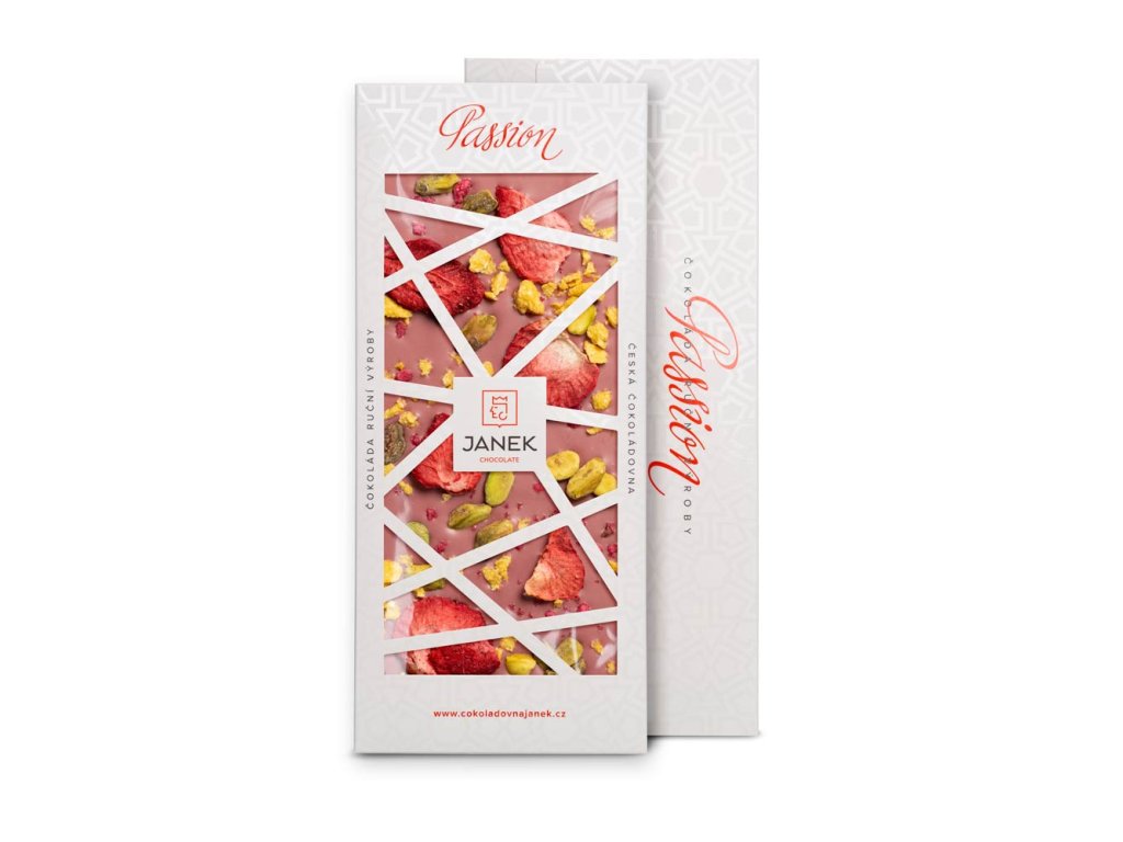 Jemná ruby čokoláda s harmonickým spojením mrazom sušených pomarančov, jahôd, pistácií a kvetov ruže v cukre. Poctivá česká výroba, výrazná prírodná chuť, bez palmového oleja a lepku, s kakaovými bôbmi zo Sumatry. Stačí ochutnať a presvedčíte sa o jej jedinečnosti. Zloženie: 48,8 % kakaovej hmoty, kakaové maslo, sušené odstredené mlieko, sušené plnotučné mlieko, lyofilizovaný pomaranč, pistácie, jahody a kvet ruže v cukre, emulgátor: sójový lecitín, regulátor kyslosti: kyselina citrónová, prírodná vanilková aróma. Minimálna trvanlivosť: 6 mesiacov. Váha: 110g
