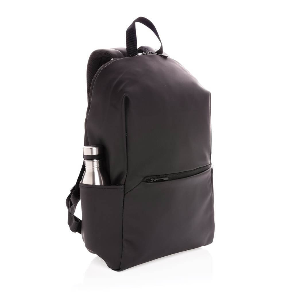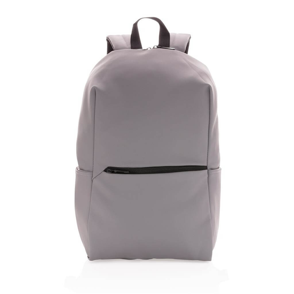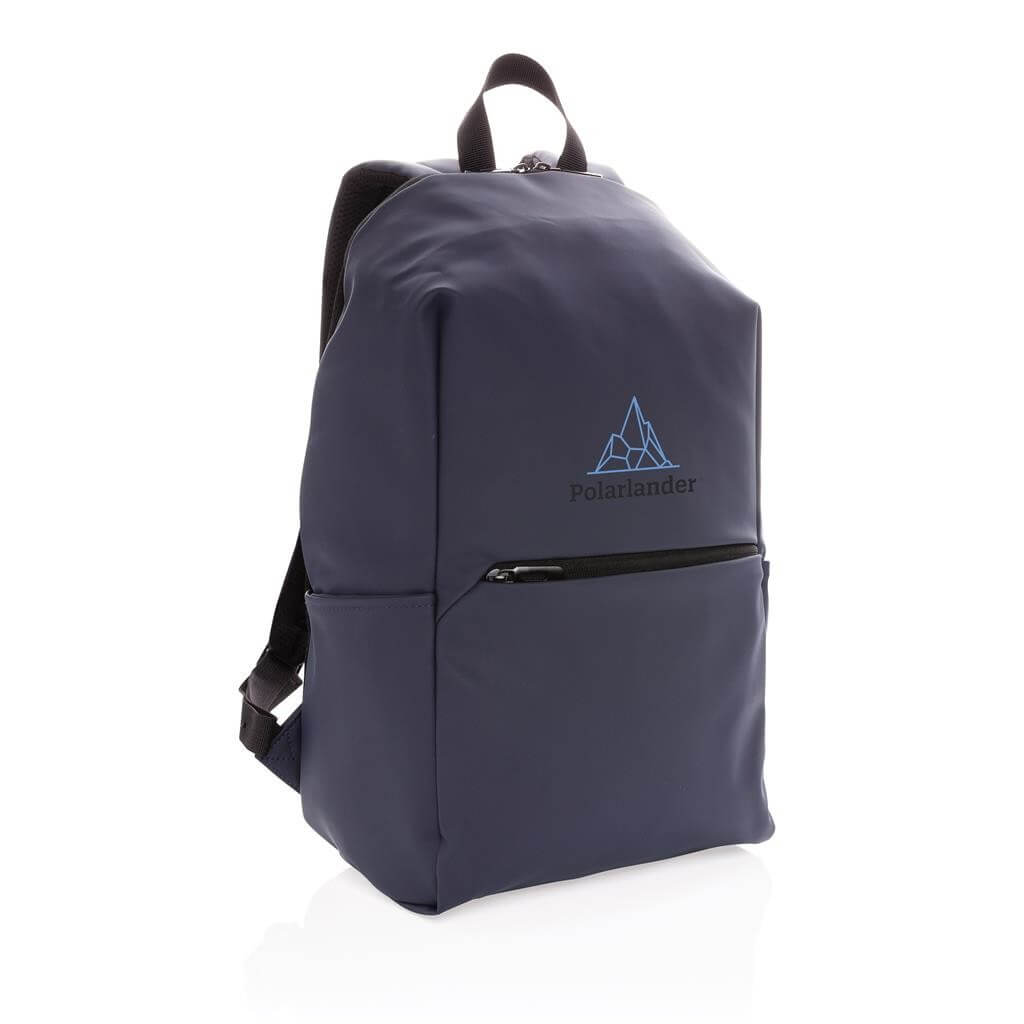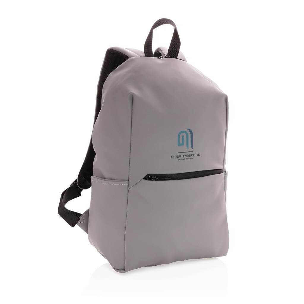 Moderný minimalistický batoh vyrobený z hladkého PU. Priestranný hlavný oddiel s vlastnou priehradkou na 15,6" notebook, 2 vnútornými vreckami a 2 očkami na perá. Prispôsobiteľné polstrované ramenné popruhy. Vonkajšia časť z PU, vnútorná časť z 210D polyesteru. Bez PVC.