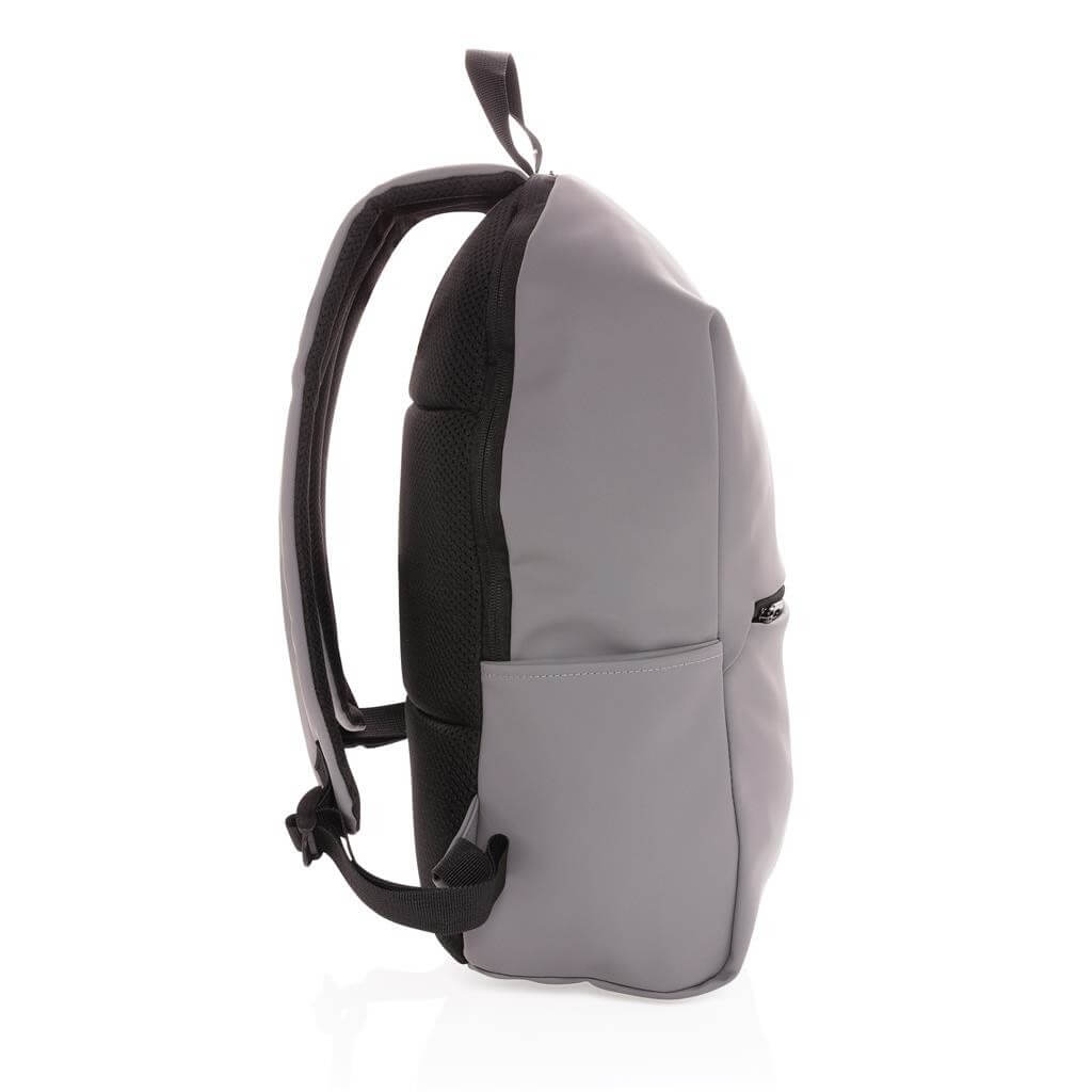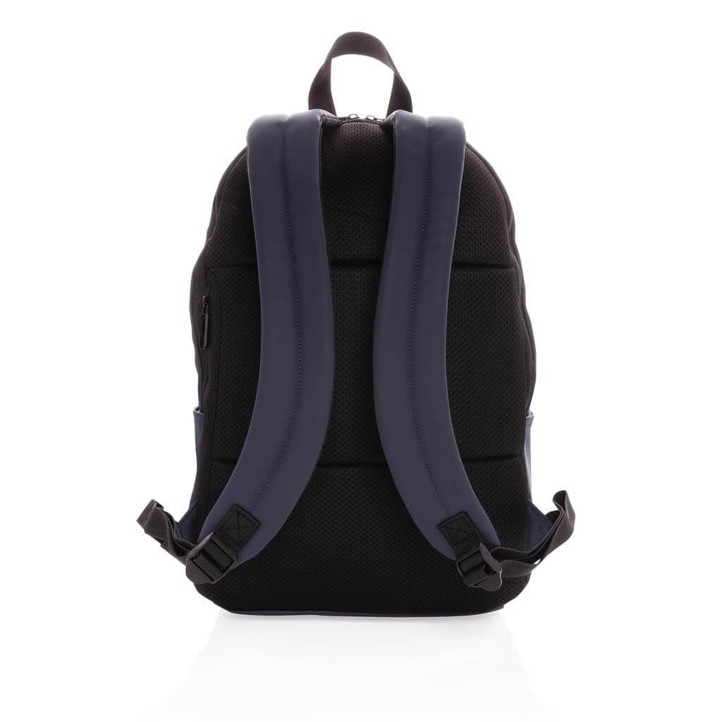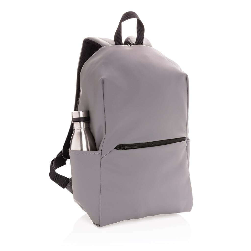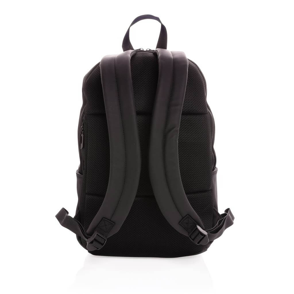 Moderný minimalistický batoh vyrobený z hladkého PU. Priestranný hlavný oddiel s vlastnou priehradkou na 15,6" notebook, 2 vnútornými vreckami a 2 očkami na perá. Prispôsobiteľné polstrované ramenné popruhy. Vonkajšia časť z PU, vnútorná časť z 210D polyesteru. Bez PVC.