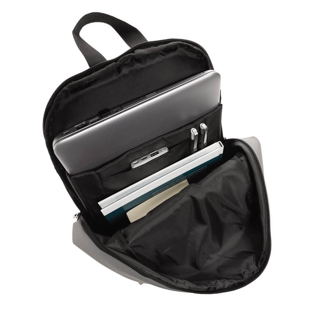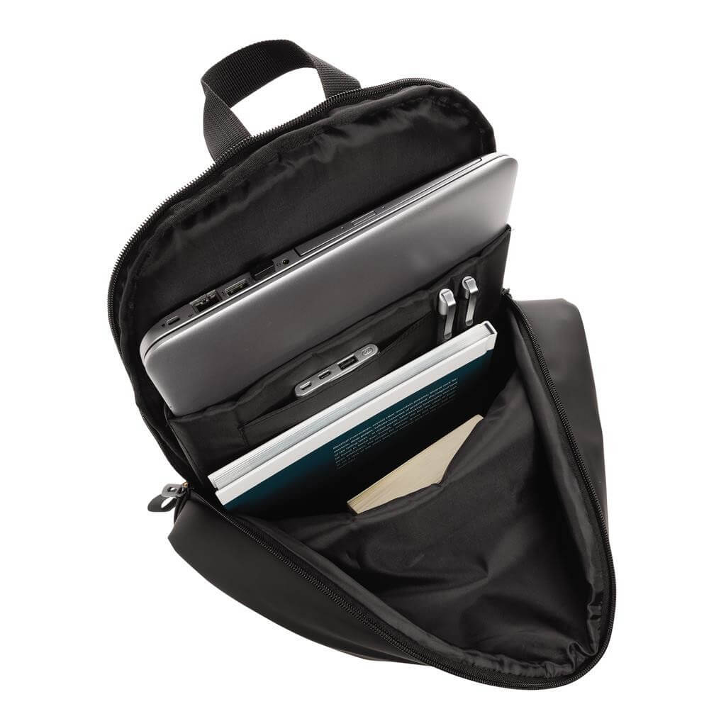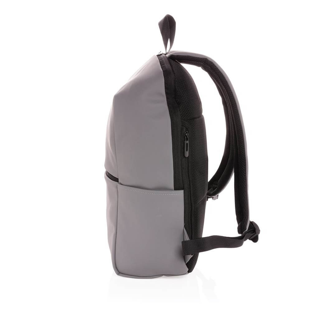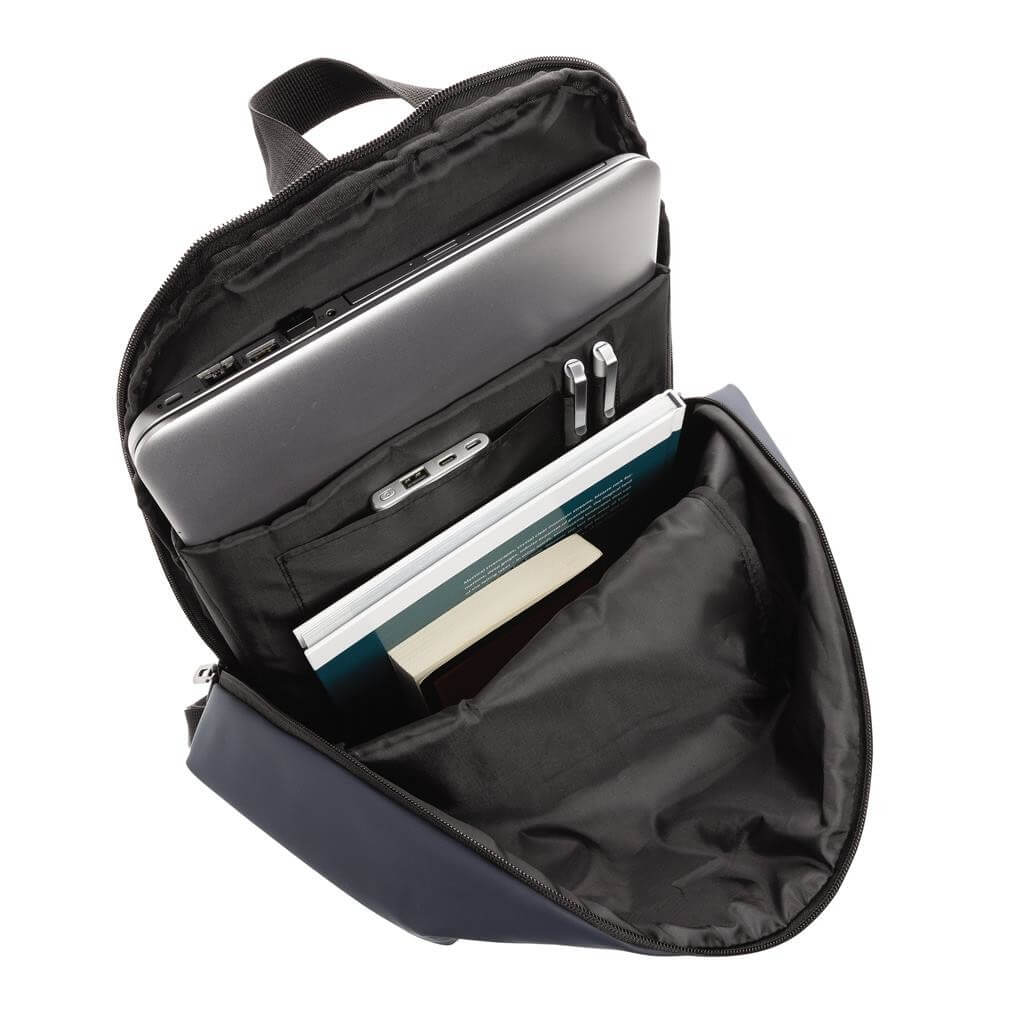 Moderný minimalistický batoh vyrobený z hladkého PU. Priestranný hlavný oddiel s vlastnou priehradkou na 15,6" notebook, 2 vnútornými vreckami a 2 očkami na perá. Prispôsobiteľné polstrované ramenné popruhy. Vonkajšia časť z PU, vnútorná časť z 210D polyesteru. Bez PVC.