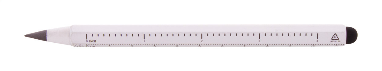 Bez atramentové pero s dlhou životnosťou z recyklovaného hliníka s dotykovým stylusom a hrotom z kovovej zliatiny, ktorý oxiduje papier. S šesťhrannou hlavnou vrátane pravítok 11 cm a 4 palce. Toto pero píše podobne ako ceruzka a navyše je stierateľné.