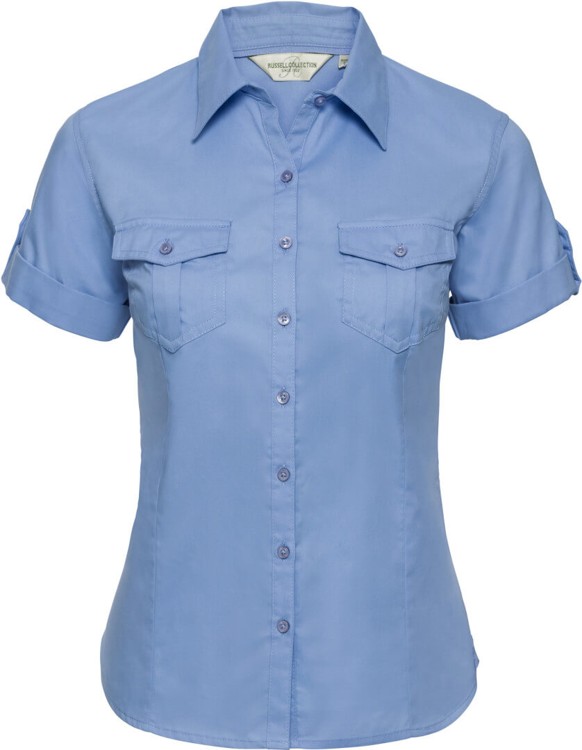 Strih zdôrazňujúci postavu, s rukávmi, ktoré možno vyhrnúť, veľkoryso strihaný golier, farebne ladiaci pás okolo krku so vzorom rybia kosť, naskladané náprsné vrecko s pätkou a zapínaním na gombík, nastaviteľná manžeta s 2 gombíkmi, náhradné gombíky.