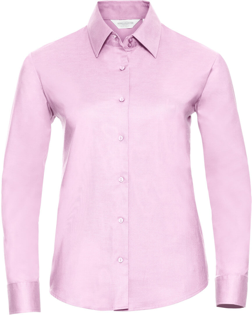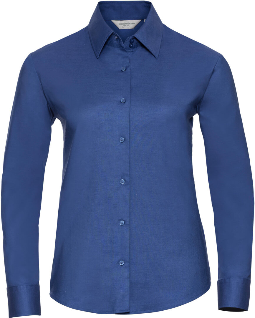 Dámska košeľa s dlhým rukávom, má klasicky tvarovaný golier, zaoblený lem, náhradné gombíky a zášivky na prsiach a chrbte, na rukávoch nastaviteľné manžety s gombíkmi.