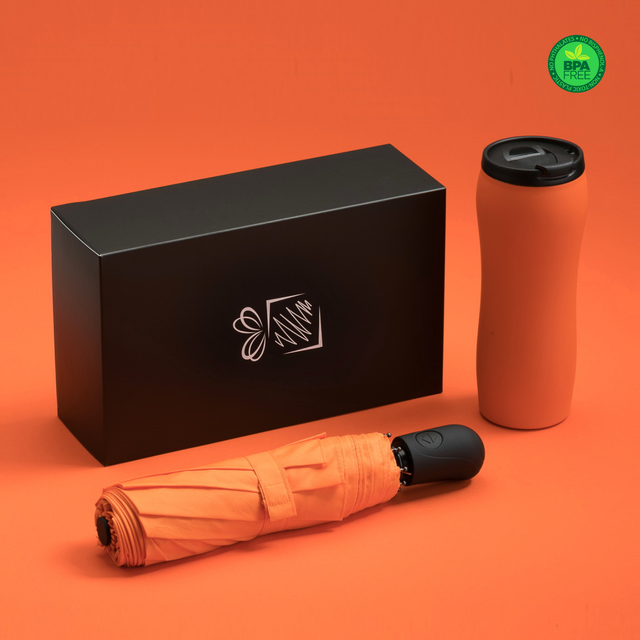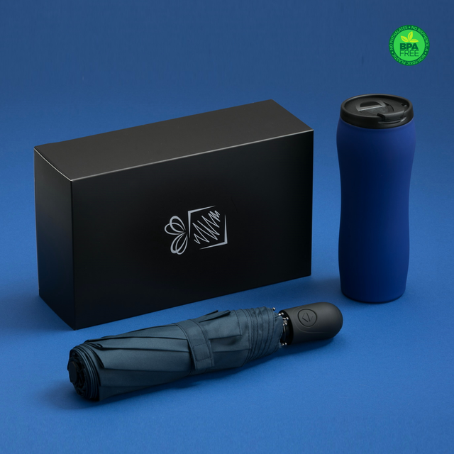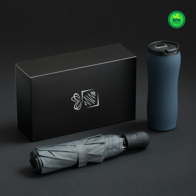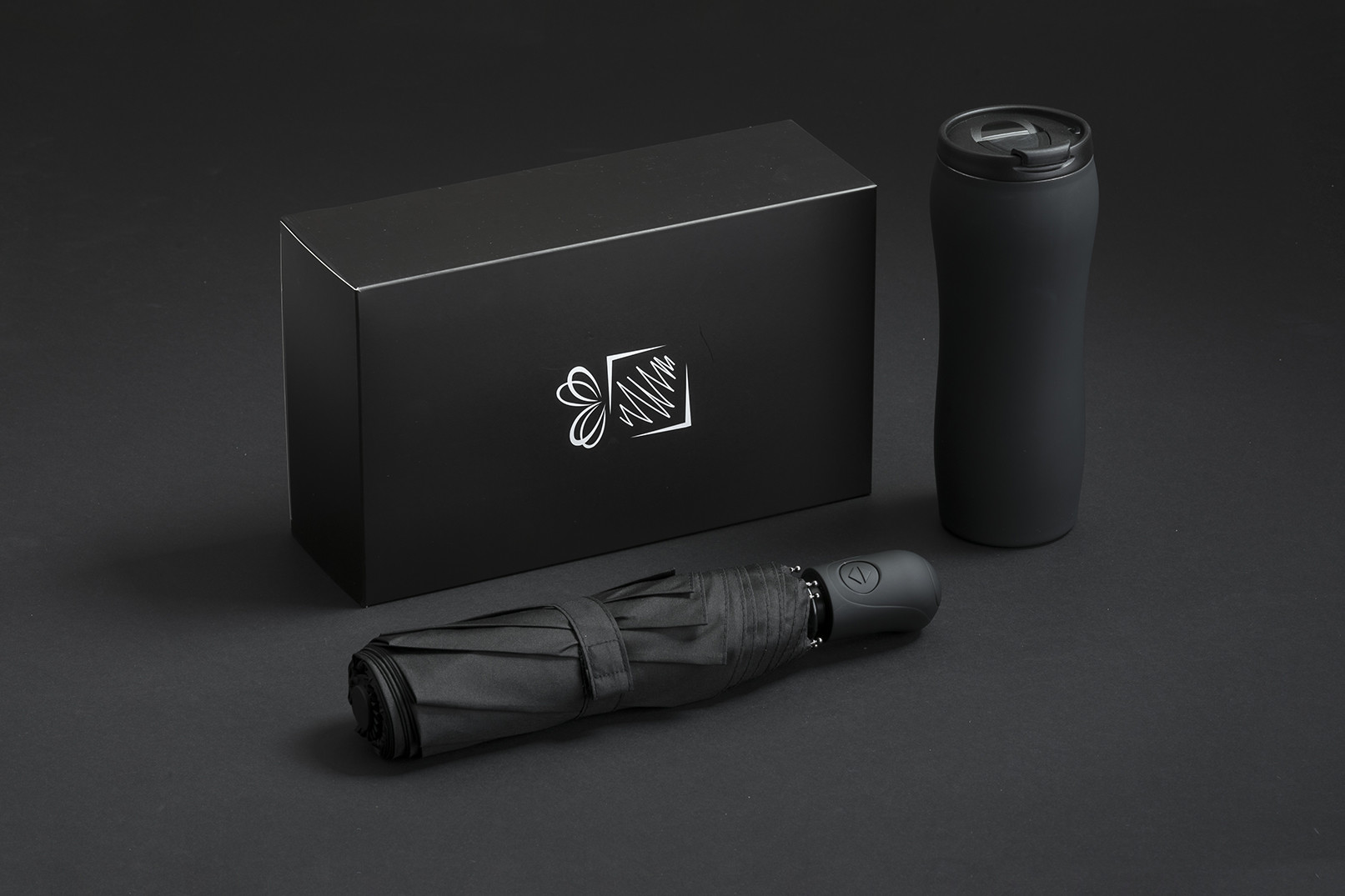 Praktická súprava obsahujúca termohrnček a plnoautomatický dáždnik z kolekcie Cambridge.