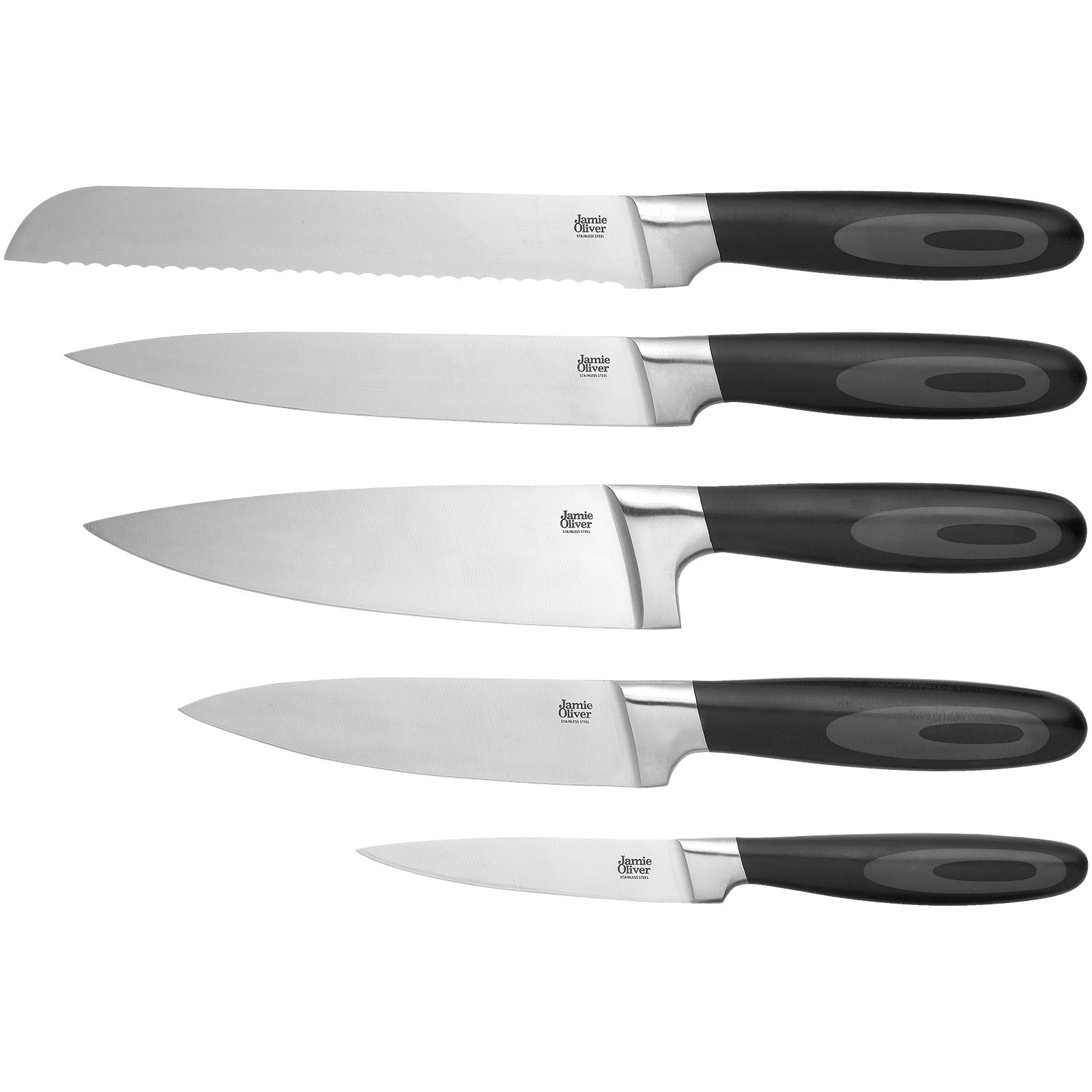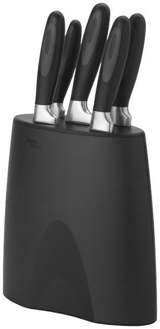 Sada 5 nožov v bloku. Blok na nože obsahuje nôž s pílovitým ostrím 11 cm, univerzálny nôž 15 cm, kuchársky nôž 19 cm, porcovací nôž 20 cm a nôž na chlieb 22 cm. Korpus bloku obsahuje závažia na zabezpečenie stability. Dodávané v darčekovej kazete Jamie Oliver. Exkluzívny dizajn. Nerezová oceľ a polykarbonát.