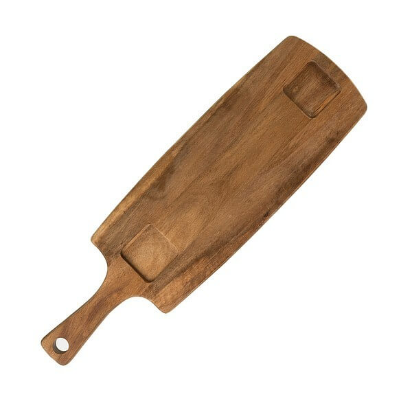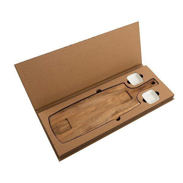 Praktická sada servírovacej dosky z dreva akácie a dvoch keramických misiek na omáčky, ktorá sa budú určite hodiť aj do vašej kuchyne. Na veľkej doske možno naservírovať rôzne druhy syrov, salám i pečiva, ktoré potom môžete doplniť omáčkou či jemne nakrájanou zeleninou v mištičkách. Balené v darčekovej krabici Vanilla Season. Rozmery: doska 50×14,4×1,7cm, miska 6,2×6,2×2,4cm, balenie 21,1×55×3,5cm. Uhlíková stopa: gCO2 e2107.