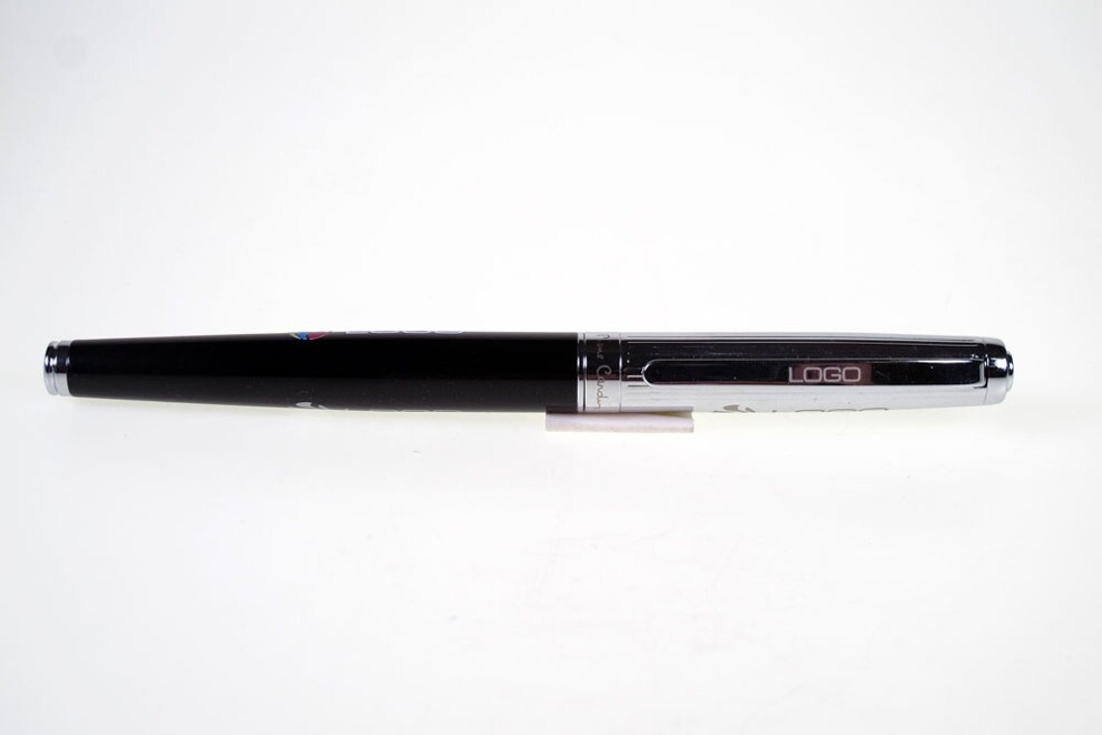 Značkový kovový roller a guľôčkové pero Pierre Cardin, ktoré možno zakúpiť osobitne alebo v sade. Spodná časť je v čiernom prevedení, vrchná strieborná časť je zdobená jemným rytím na povrchu. Guľočkové pero má otočný mechanizmus, hrot rolleru je chránený strieborným vrškom. Roller obsahuje značkovú nemeckú náplň Schmidt® v modrej farbe s hrotom 0,6 mm, gulôčkové pero kvalitnú modrú náplň s hrotom 1 mm. Priložená je aj náhradná náplň v čiernej farbe. Balené v luxusnej krabičke Pierre Cardin, dodávané s certifikátom pravosti. Rozmery: guľôčkové pero 1,1 × 13,7 cm, roller 1,1 × 13,8 cm, balenie 17,5 × 5,5 × 3,5 cm.