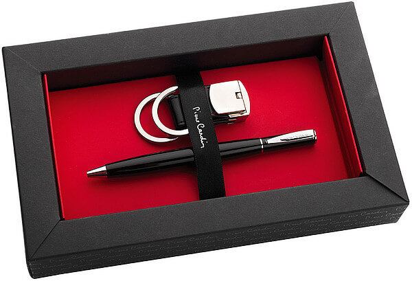 Značková sada koženej kľúčenky a kovového guľôčkového pera Pierre Cardin. Kľúčenka z pravej kože obsahuje dva krúžky na prichytenie, ktoré od seba možno oddeliť a vytvoriť tak dve kľúčenky. Guľôčkové pero je navrhnuté v elegantne hladkom dizajne a upúta svojím atypickým tvarom, vďaka ktorému sa veľmi pohodlne používa. Obsahuje kvalitnú náplň v modrej farbe s hrotom 1 mm. Balené v luxusnej krabičke Pierre Cardin, dodávané s certifikátom pravosti. Rozmery: kľúčenka 3,3 × 6,9 × 1,5 cm, guľôčkové pero 1,2 × 13,7 cm, balenie 21, 4 × 13,4 × 3,5 cm.