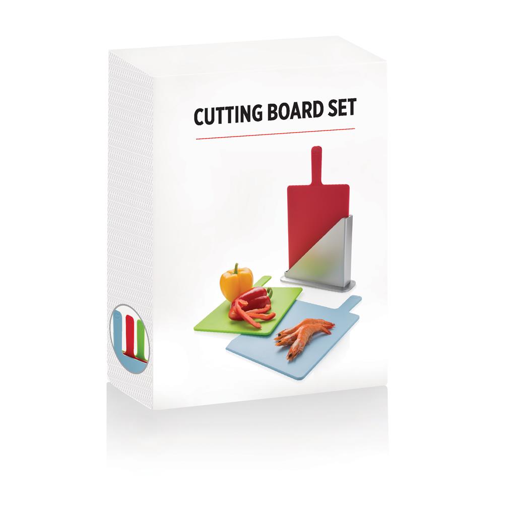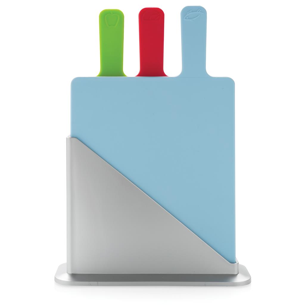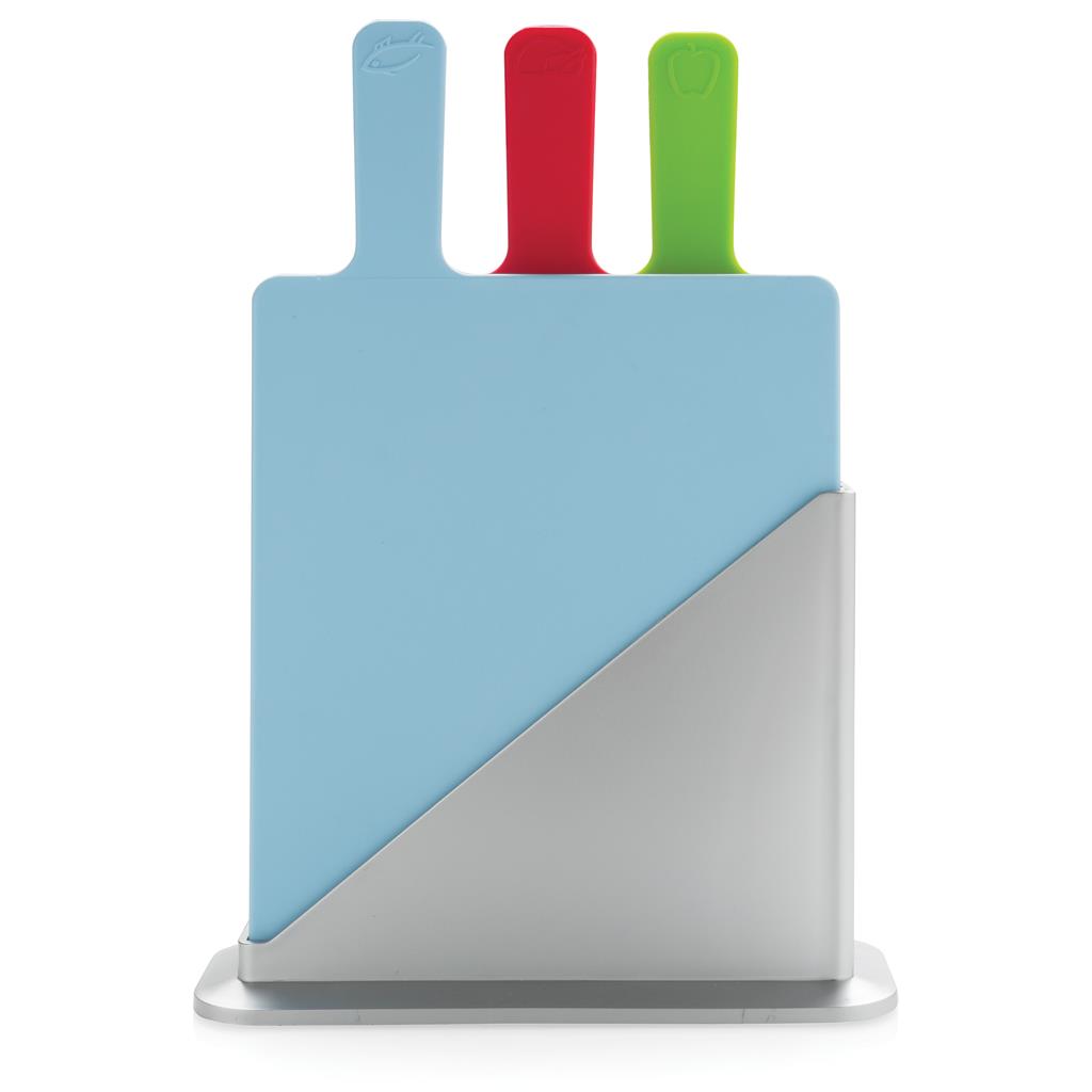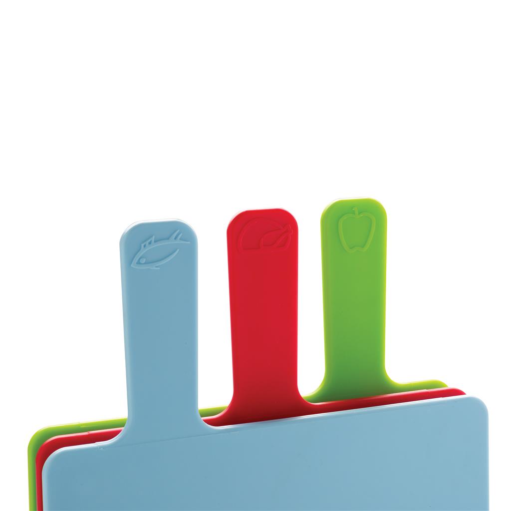 Moderné sada hygienických kuchynských dosiek. Slúži tiež ako úložný obal pre 3 hygienických dosiek na krájanie vyrobená z PP vhodná do umývačky riadu (veľkosť lopáriky 23,5 x 19,5 cm). Farba na obrázku značí, pre aký typ potravín by maly byť doštičky používané.