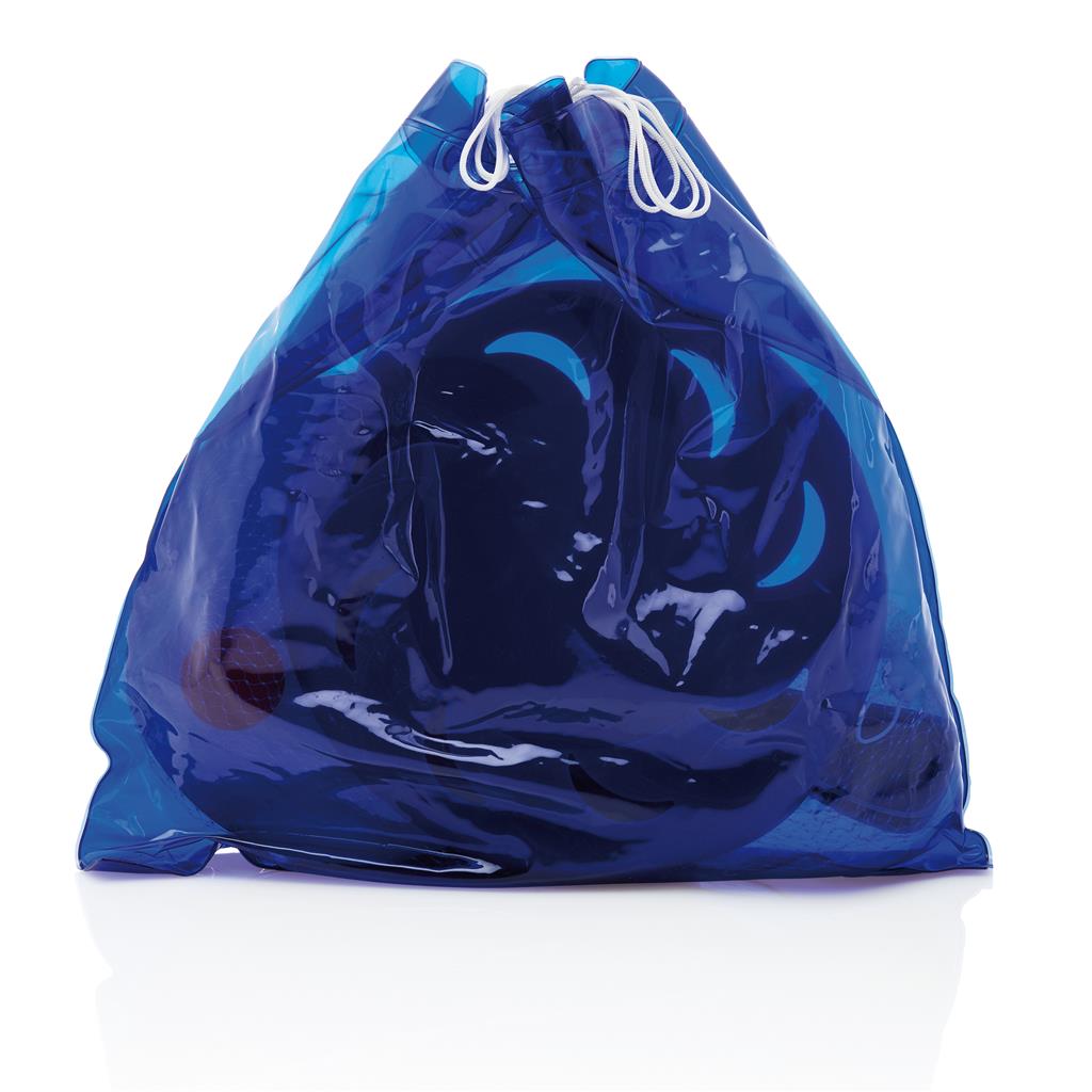 Nafukovacia taška v tvare vankúša obsahuje frisbee tanier, plážové rakety s loptičkou a plážovú loptu.