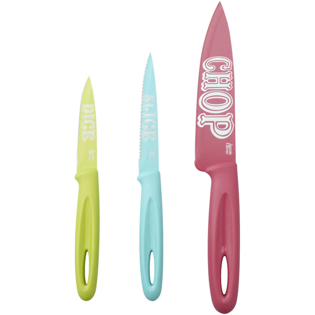 Sada nožov Funky. Sada obsahuje 15 cm kuchársky nôž, 11 cm zúbkovaný nôž a 8,5 cm nôž s pílovitým ostrím. Tvrdý nepriľnavý povrch, vhodné pre použitie v umývačke. Dodávané v darčekovej kazete Jamie Oliver. Exkluzívny dizajn. Nerezová oceľ.