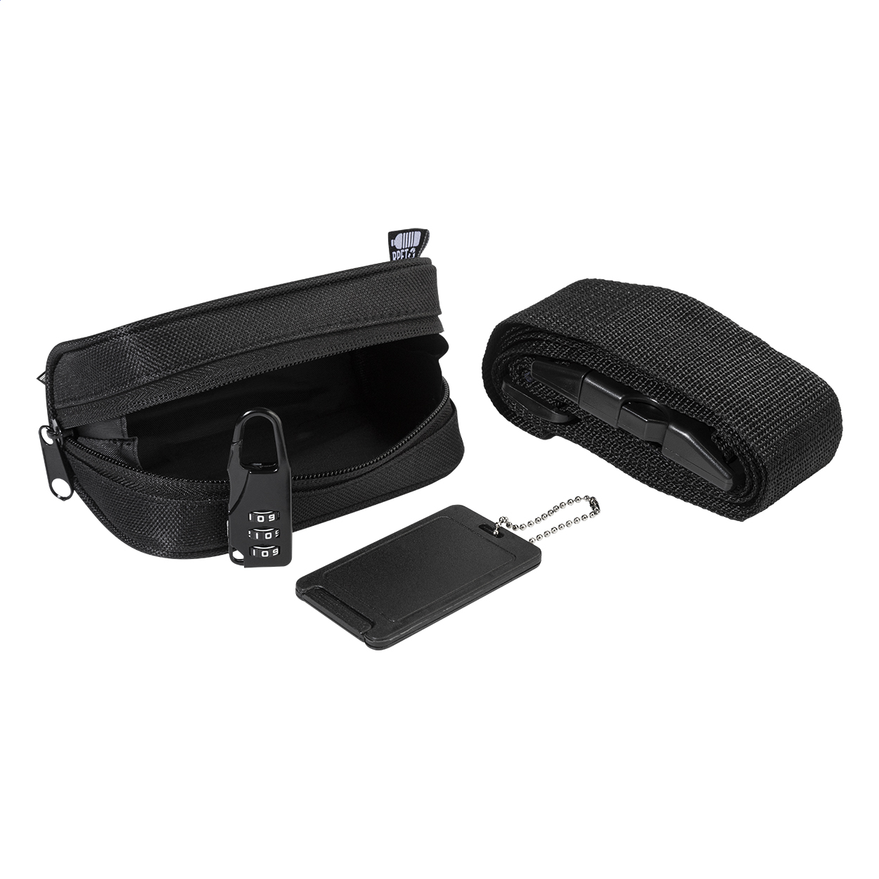 3dielna cestovná súprava v puzdre z RPET na zips. Vrátane polyesterového pásu na batožinu s 3-miestnym zámkom, visačky na batožinu z PP a kovového 3-miestneho zámku na kufor. Polyester 600D RPET s charakteristickým štítkom RPET. New. Go Green