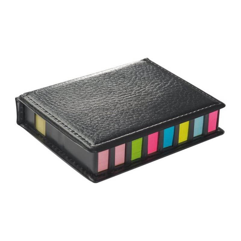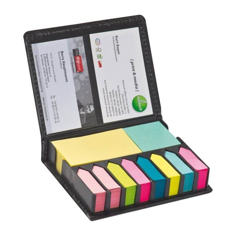 Praktická samolepiaca poznámková sada. Ideálny držiak na písací stôl s 200 listovým modrým a žltým poznámkovým blokom a 200 samolepiacích poznámkových pásikov v 6 rôznych farbách.Vo veku je ďalší priestor napr. pre vizitky.