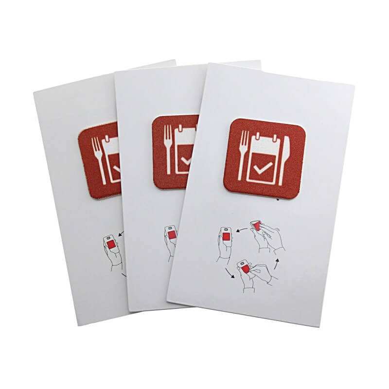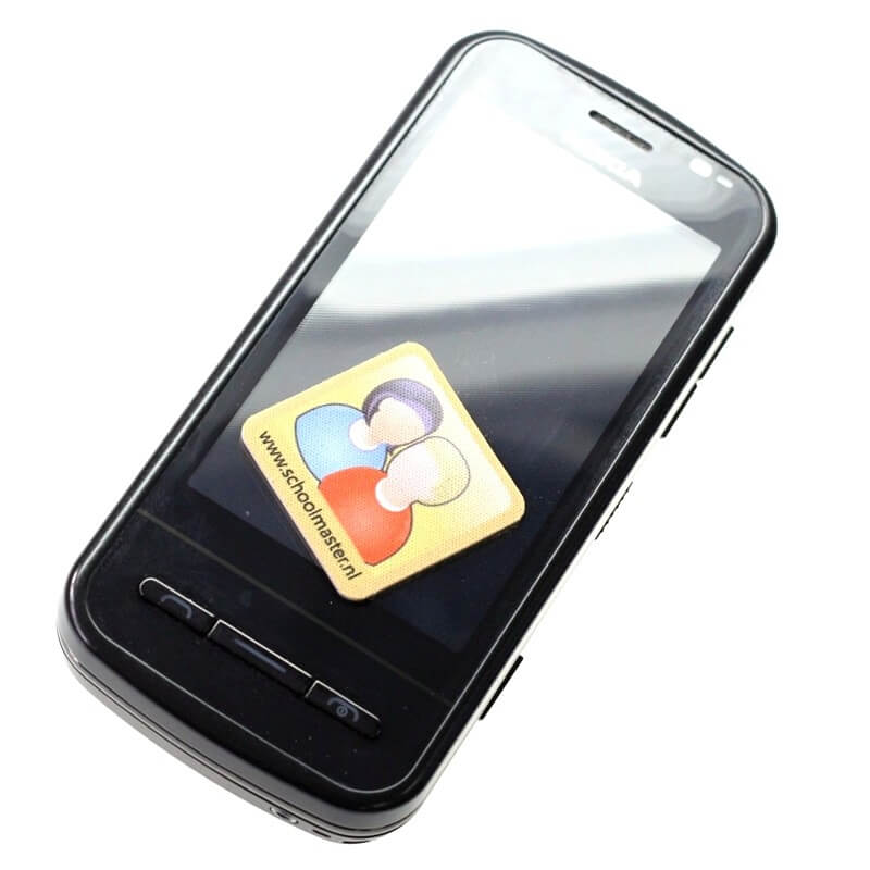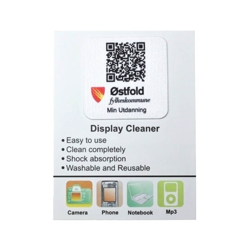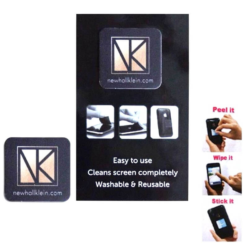 Štvorcové samolepiace látkové čistidlo na displej, veľkosť 38 x 38 mm, vlastná CMYK potlač, balené v PP vrecúšku, alebo v PP vrecúšku + CMYK potlačená kartónová karta s rozmermi 90 * 55 mm (prípadne iných), vlastná grafika