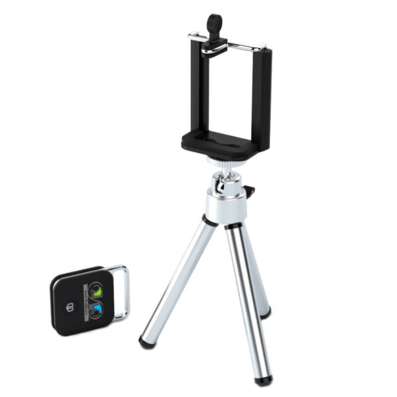 SELFIE SET - Univerzálna Bluetooth spúšť pre mobilné telefóny + statív (trojnožka), darčeková krabička. Na vzdialenosť až 10 m dokáže ovládať spúšť vo Vašom Smartphone alebo iPhone a robiť tak fotky v pozíciách, ktoré Vám mobil v ruke nikdy nedovolí. BT spúšť je možné nosiť ako prívesok na kľúče a kedykoľvek okamžite použiť. Dlhá výdrž batérie (cca 6 mesiacov pri použití 10x denne). Balené v darčekovej krabičke spolu s univerzálnym teleskopickým statívom (trojnožkou).