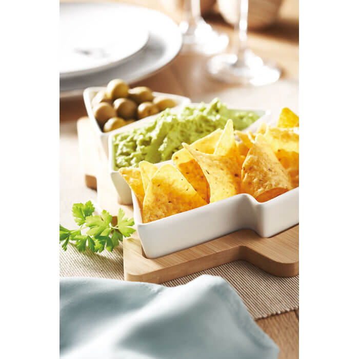 Bambusový servírovací podnos v tvare stromčeka a tromi keramickými servírovacími miskami. Na tejto prírodnej servírovacej doske môžete servírovať občerstvenie, syry a ďalšie chutné pokrmy. Podnos a keramické misky môžete prezentovať ako celok alebo ich oddeliť a servírovať tak viac druhov jedla. Bambus je prírodný materiál, môže dôjsť k miernym zmenám farby, dekorácie a veľkosti.