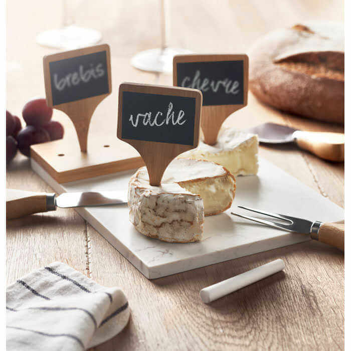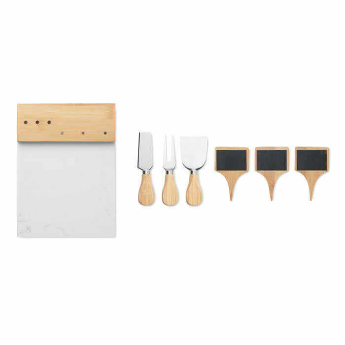 Servírovacia doska z mramoru a bambusu vrátane 3 nožov na syr a 3 popisovačov. Tento tanier na syr alebo servírovací podnos pôsobí vďaka bielemu mramorovému dielu luxusne. Bambusová časť dodáva celej doske prirodzený vzhľad. S tromi rôznymi nožmi na syr a značkami predjedál môžete svoje syry alebo iné občerstvenie predviesť na večierku alebo večeru vo veľkom štýle. Vrátane kriedy. Celá sada je balená v darčekovej krabičke. Bambus je prírodný materiál, u jednotlivých položiek sa môžu mierne líšiť farby a veľkosti, čo môže ovplyvniť konečný výsledok dekorácie.