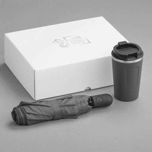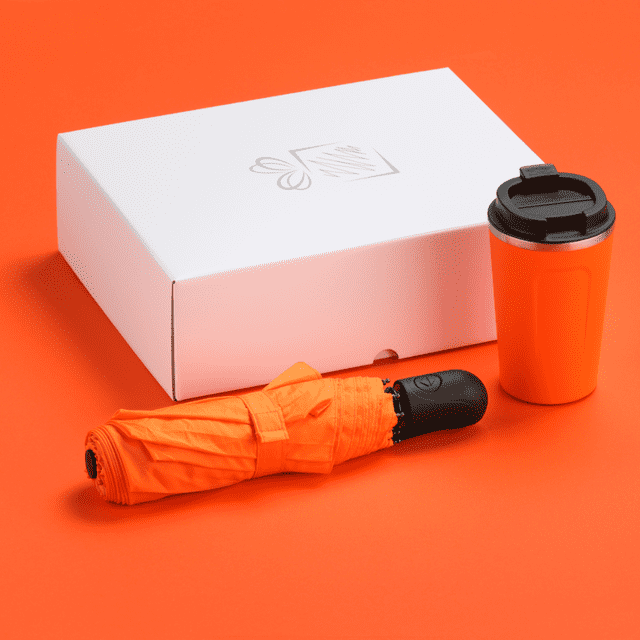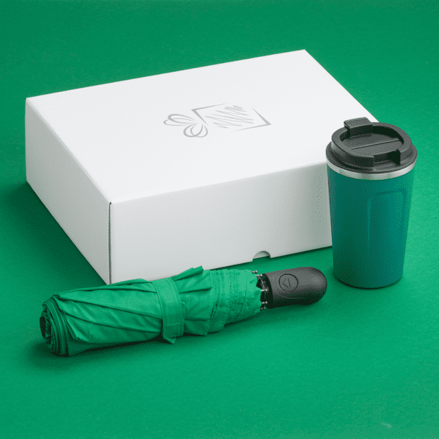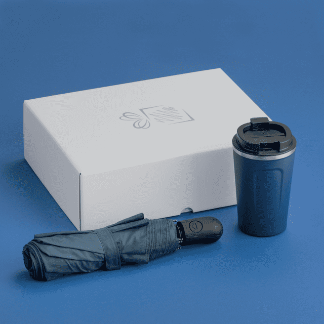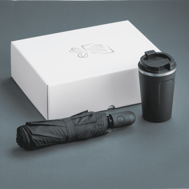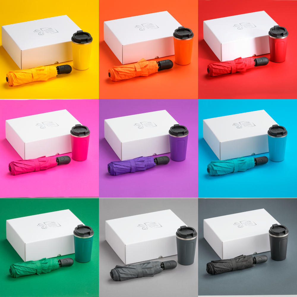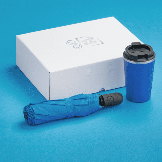 Praktická súprava pre ľudí na cestách, obsahuje severský termohrnček a skladací dáždnik z kolekcie Cambridge.