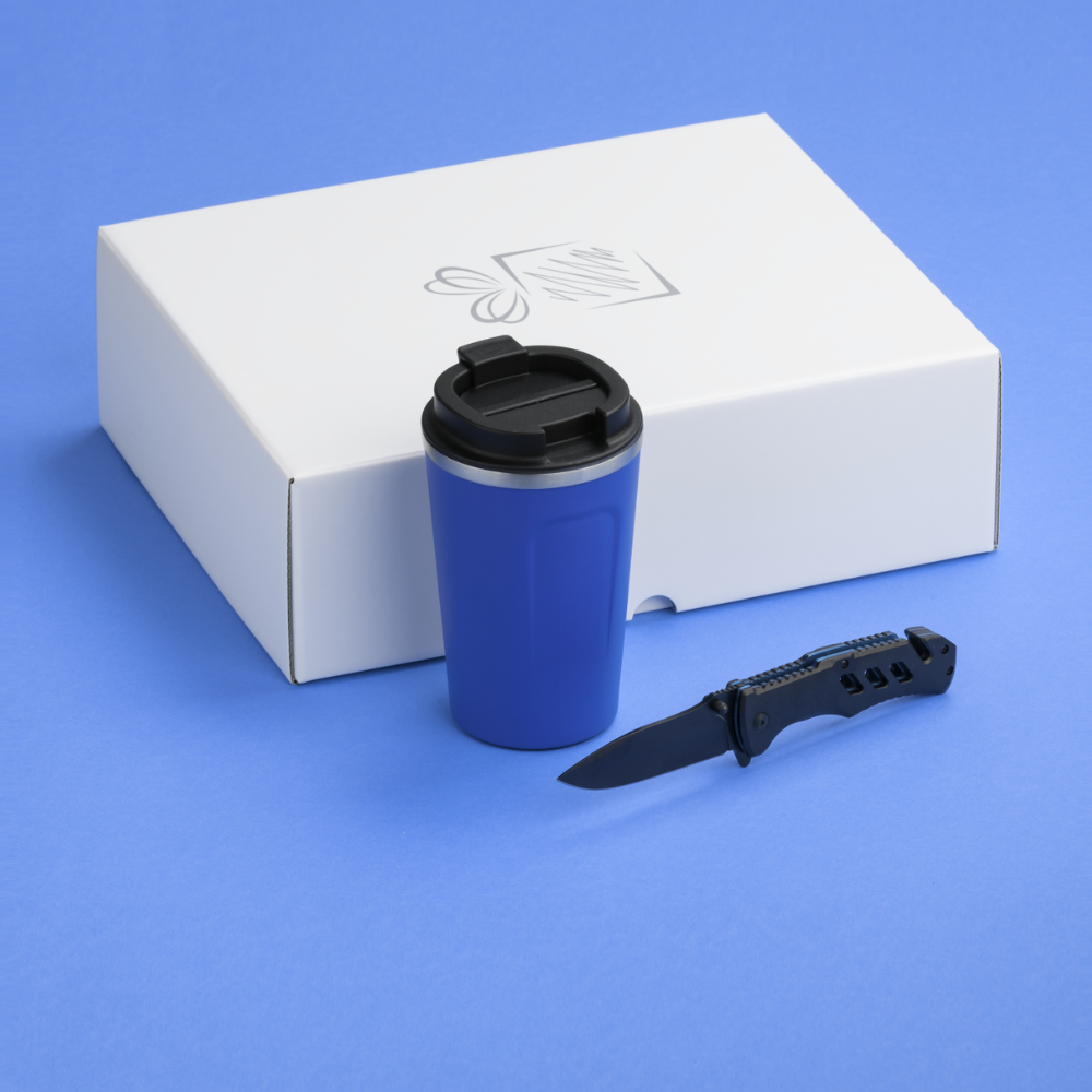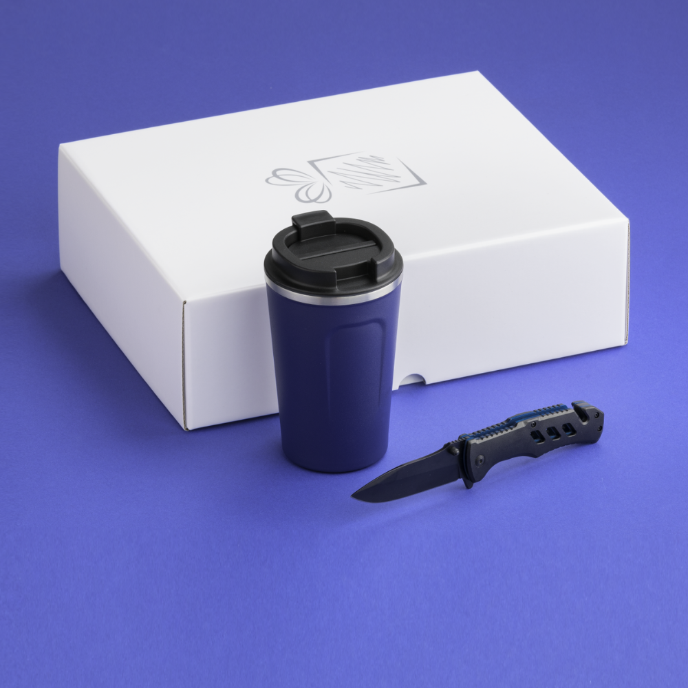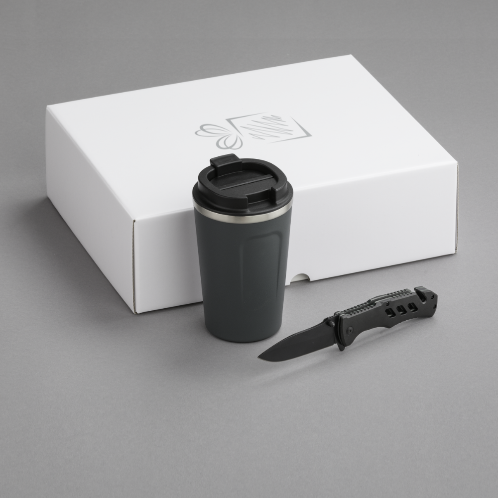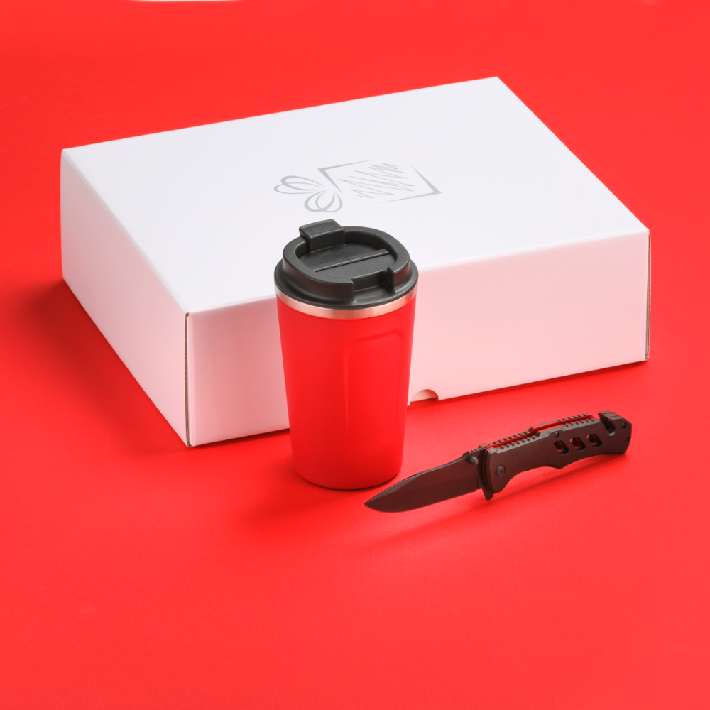 Praktická sada pre vodičov áut. Termohrnček s výbornými izolačnými vlastnosťami a záchranná pomôcka s funkciou rezačky bezpečnostných pásov v aute a rozbíjača okien. Dostupné v mnohých farbách. Balené v elegantnej bielej darčekovej krabičke.