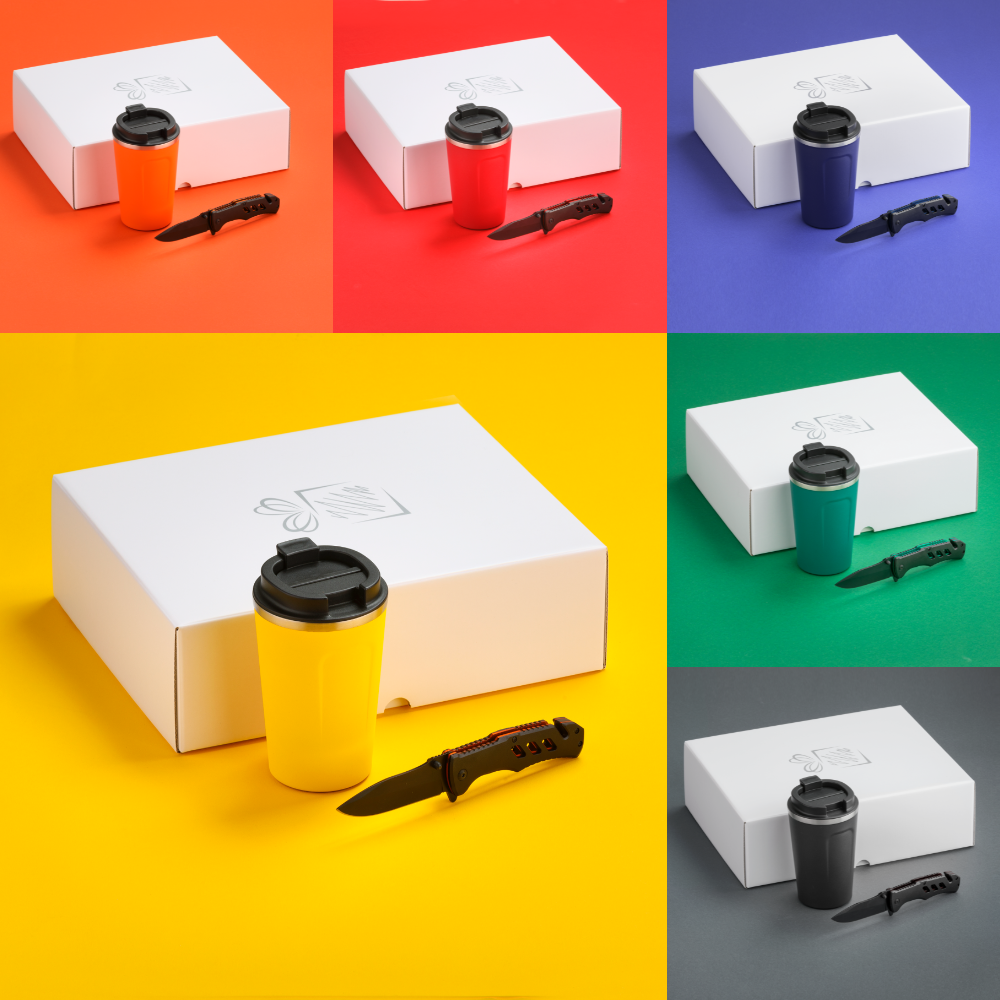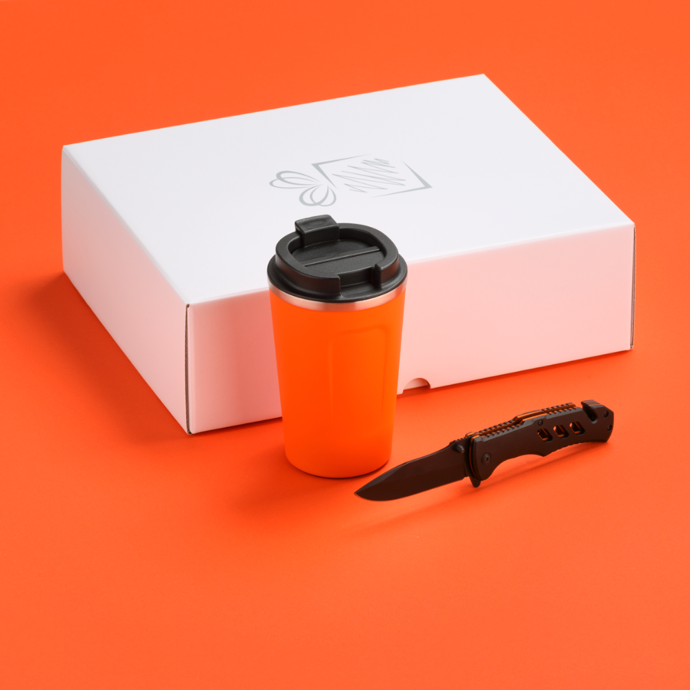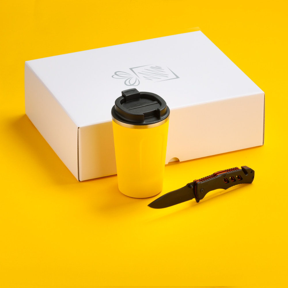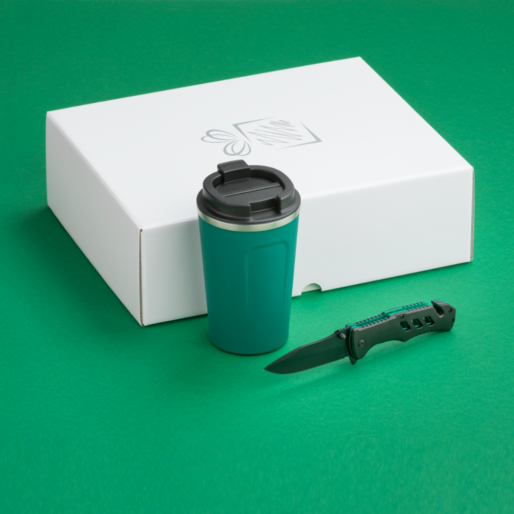 Praktická sada pre vodičov áut. Termohrnček s výbornými izolačnými vlastnosťami a záchranná pomôcka s funkciou rezačky bezpečnostných pásov v aute a rozbíjača okien. Dostupné v mnohých farbách. Balené v elegantnej bielej darčekovej krabičke.