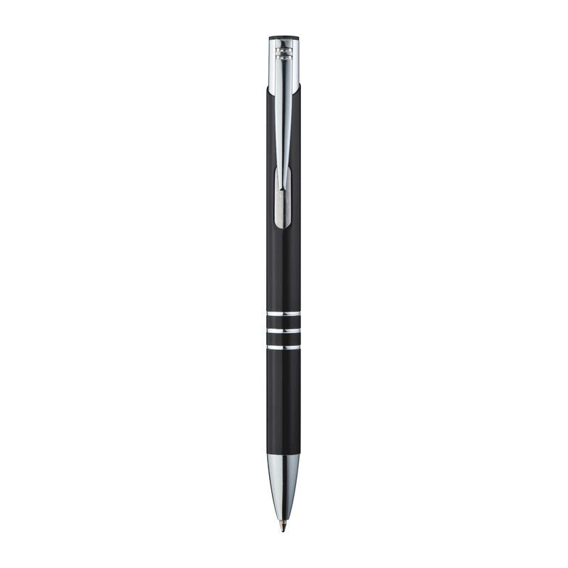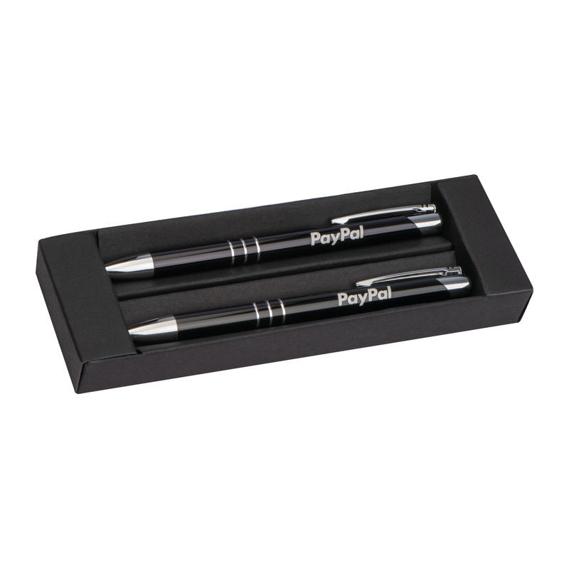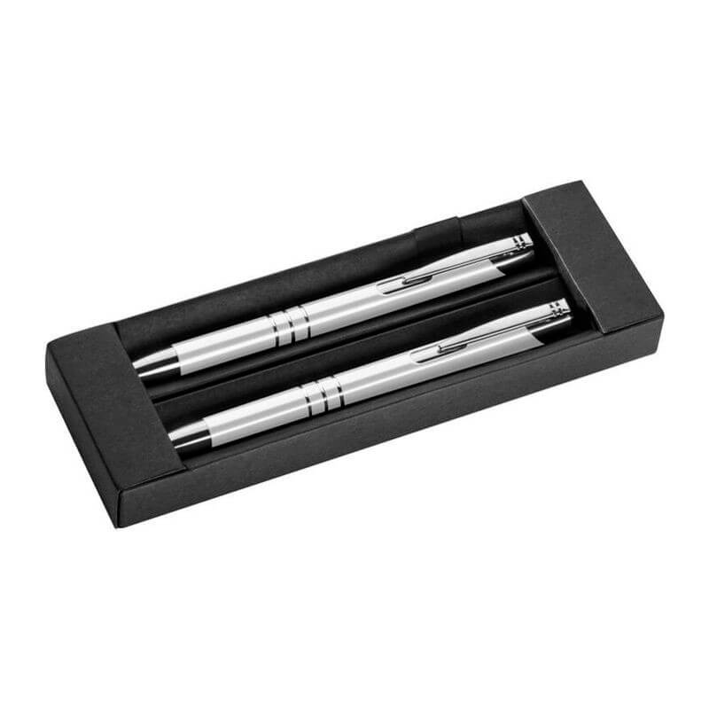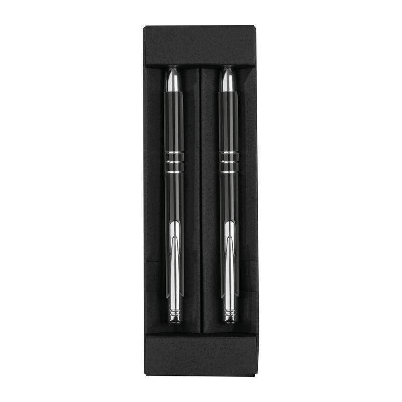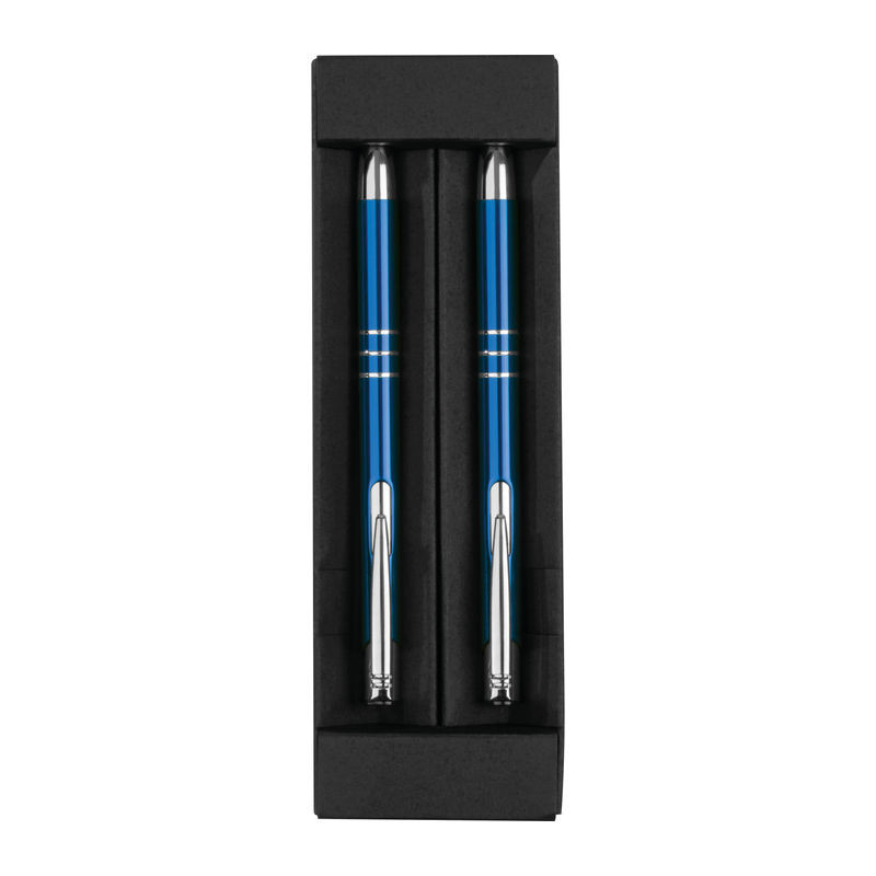 Kovové pero a pentelka v čiernom papierovom boxe. Pero disponuje veľkou modrou náplňou. Ako potlač odporúčame gravírovanie.