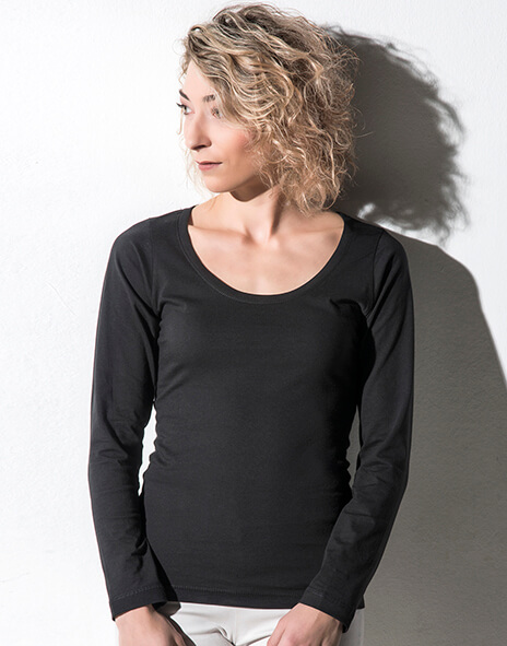 ·hlboký okrúhly výstrih s rebrovaným lemom, spevňujúca páska vzadu na krku ·bočné švy ·ploché švy na manžetách dlhých rukávov a na spodnom leme ·mierne priliehavé ·neutrálny štítok veľkosti na krku