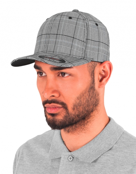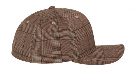 240 g/m², 97% polyester, 3% elastan, vzor Glen check, 6-panelová šiltovka, štruktúrovaný povrch, vrchol s ôsmimi radmi prešívania, čierny podhľad pre Black/White, khaki podhľad pre Brown/Khaki, uzavretá zadná časť, elastická.