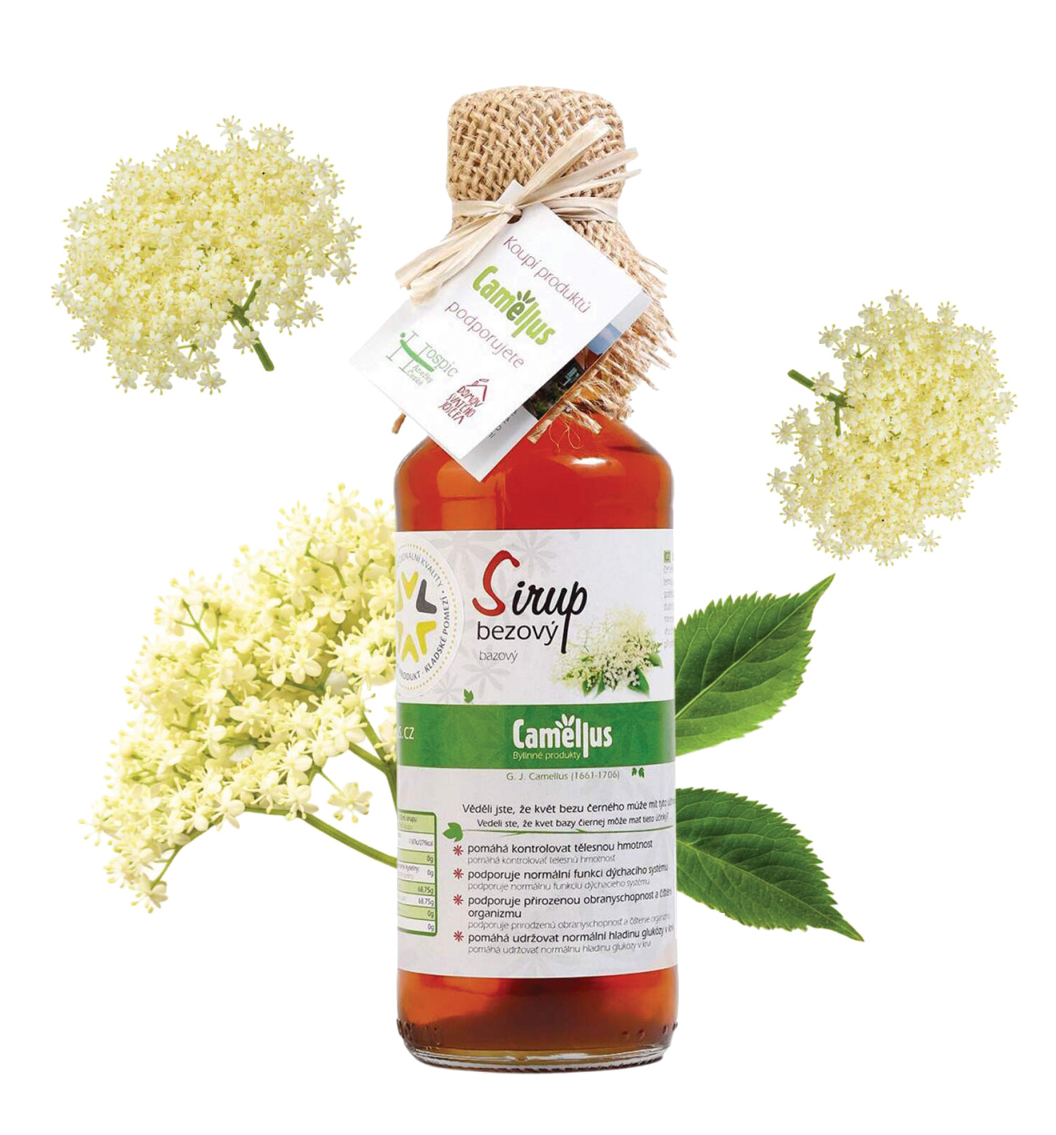 Bylinný sirup s prírodnou príchuťou bazy, bez konzervantov a umelých farbív. Obsahuje 46,5 % extraktu zo sušených kvetov bazy čiernej, sladený cukrom. Vhodný na prípravu horúcich aj studených nápojov – riedi sa v pomere 1:8 s vodou. Pred použitím pretrepať. Prírodný zákal alebo usadenina nemajú vplyv na kvalitu. Objem: 500 ml