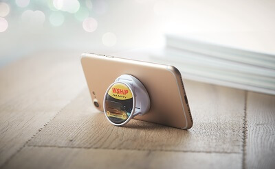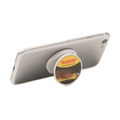 Skladací stojan a držiak na telefón z ABS s plnofarebnou potlačou. Na stojan je možná priama potlač alebo nálepka. Veľkosť: 40 x 40 mm. Každá položka je zabalená v samostatnom vrecúšku. Držiak je možné zakúpiť vo farbách podľa štandardného vzorkovníka v galérii alebo podľa vlastných predstáv (pri odbere od 2.500 ks).