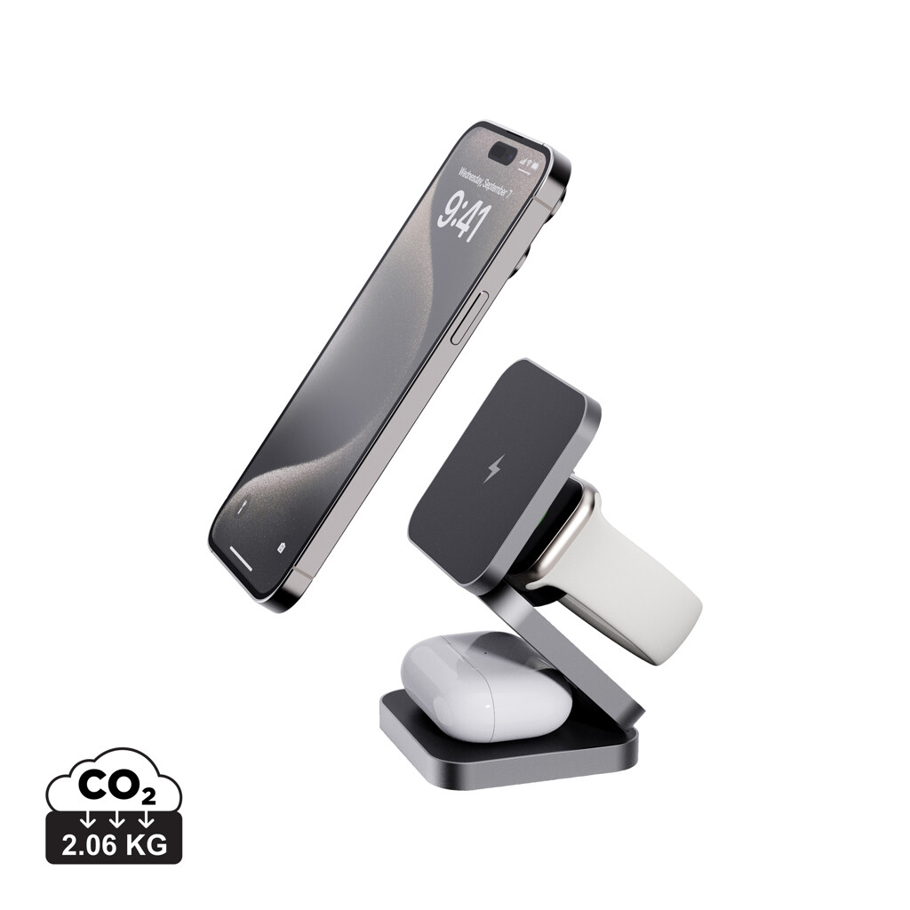 "Skladacia bezdrôtová nabíjačka 3 v 1. Magnetická 15 W časť pre väčšie zariadenia, 5 W časť pre menšie zariadenia (napr. slúchadlá), 2,5 W časť pre chytré hodinky (iba Apple Watch). Vyrobené z RCS recyklovaného ABS a hliníka. Celkový podiel recyklátu podľa váhy produktu: 38 %. RCS certifikácia zaisťuje garanciu použitia recyklovaného materiálu vďaka transparentnému prehľadu nad dodávateľským reťazcom. Vrátane 120cm USB C kábla z RCS recyklovaného TPE. Balené v FSC® kraftovej krabičke. Vstup pre optimálne použitie: 9V/3A. Výstup: veľká časť: 9V/1.1A; 9V/1.67A (15W), stredná časť: 5V/1A (5W), časť na hodinky: 5V/0.5A (2.5W). Bez PVC."