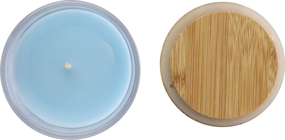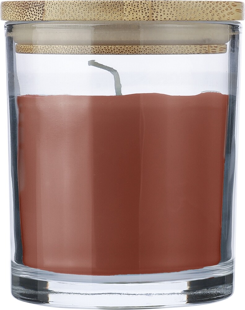 Sklenená sviečka so 120 gramami farebného vosku a vanilkovou vôňou, umiestnená v priehľadnej sklenenej nádobe s bambusovým viečkom. Poskytuje približne 20 hodín horenia. Jednotlivo balené v bielej kartónovej tube. Výška: 8,5 cm